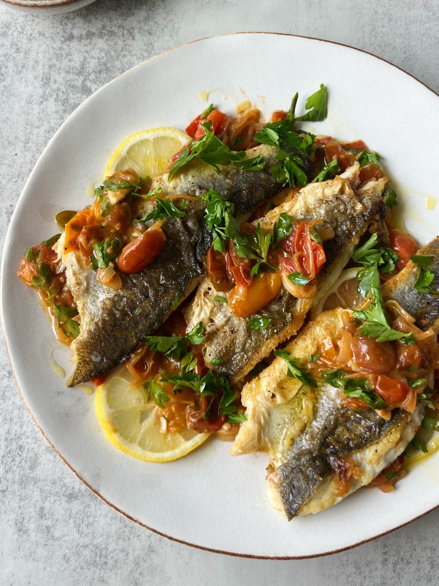 - Serve the tomato mix over the fish with a drizzle of olive oil, squeeze of lemon juice, flakey salt and chopped parsley