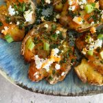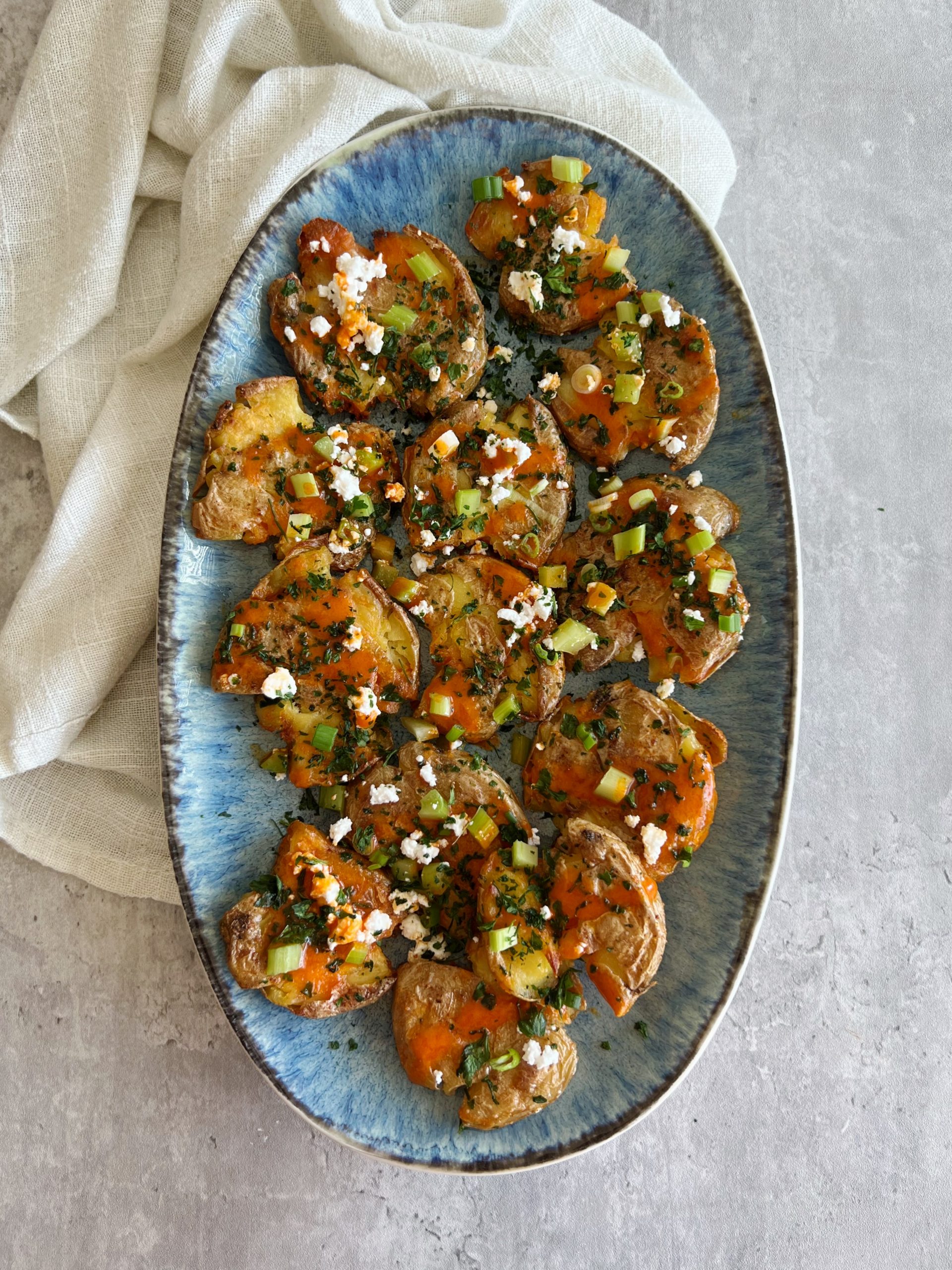 Spicy buffalo smashed potatoes are the perfect appetizer or side dish! They’re boiled, smashed, then roasted until crispy and topped with hot sauce, herbs and crumbled cheese.