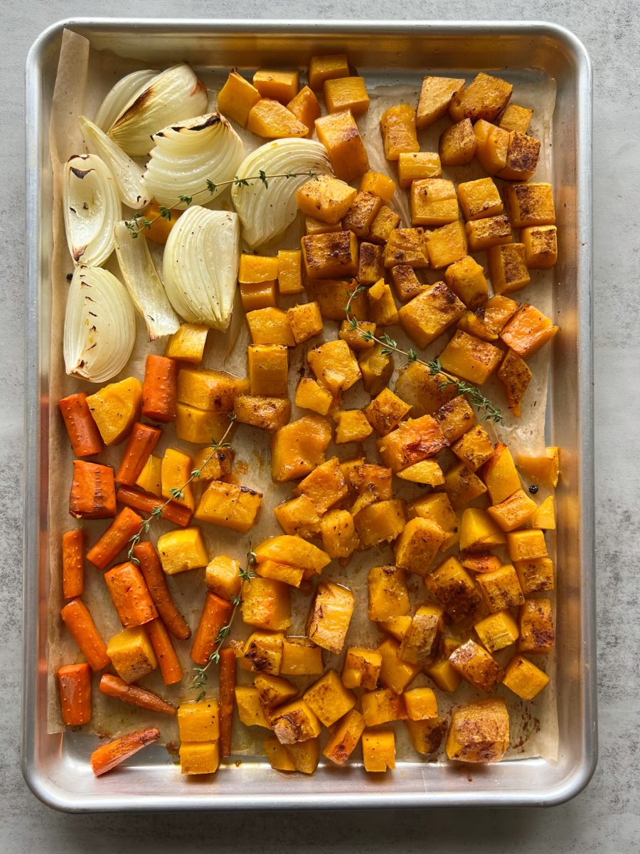 - Add the cubed butternut squash, sliced onion and chopped carrots to a large sheet pan. Toss together with about 2 tbsp olive oil and the salt, pepper and cinnamon.