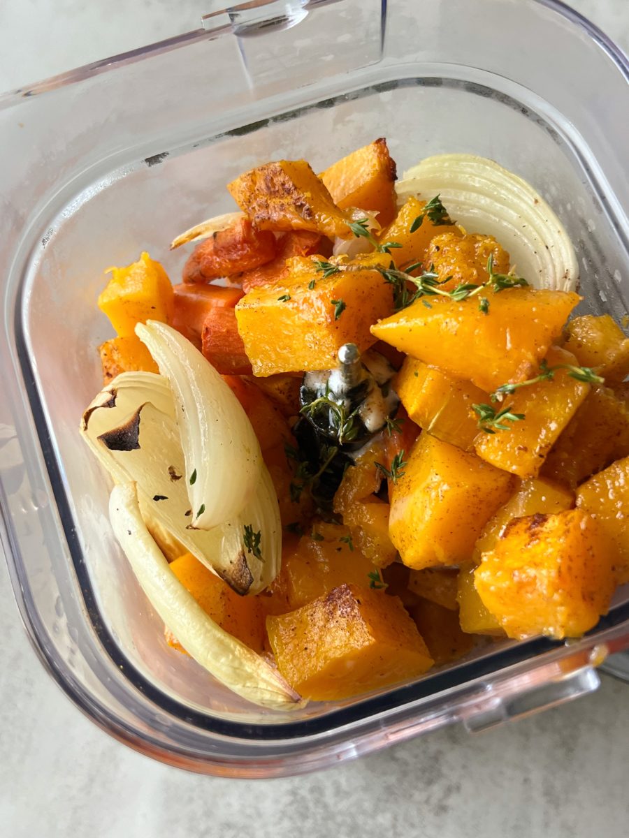 - Blend the soup– Add the roasted vegetables to a blender or a pot if using an immersion blender, and blend together with the broth, coconut milk and spices