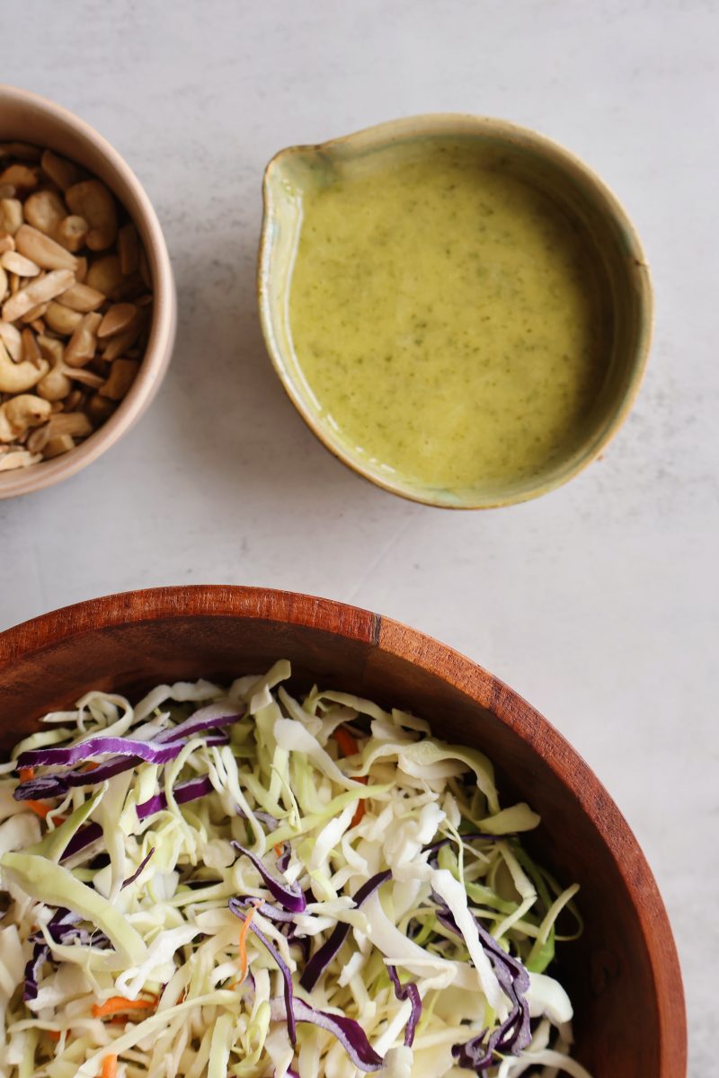 Then, simply blend the dressing in a small food processor or blender cup and massage it into the cabbage.