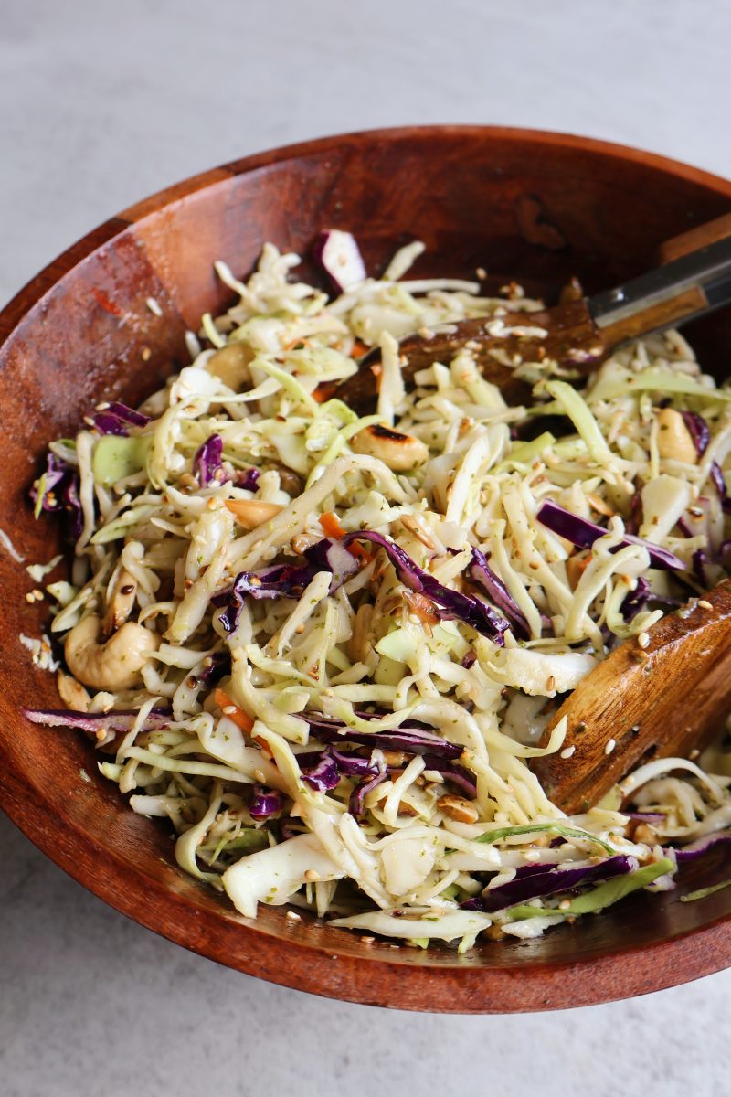 - This salad can be prepared up to a day in advance. If preparing ahead, you can mix the cabbage with the dressing, and add the toasted nuts in before serving.