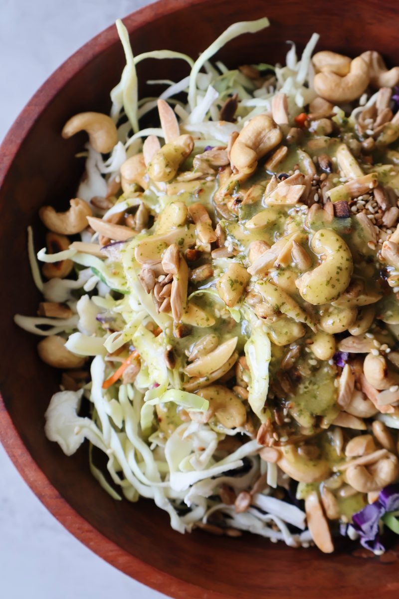 This salad is the perfect combination of crunch, zesty and fresh flavors. Shredded cabbage is tossed in a honey mint vinaigrette and mixed with a mix of toasted nuts and seeds. It’s an easy side dish to enjoy with salmon, chicken, or a summer barbecue.