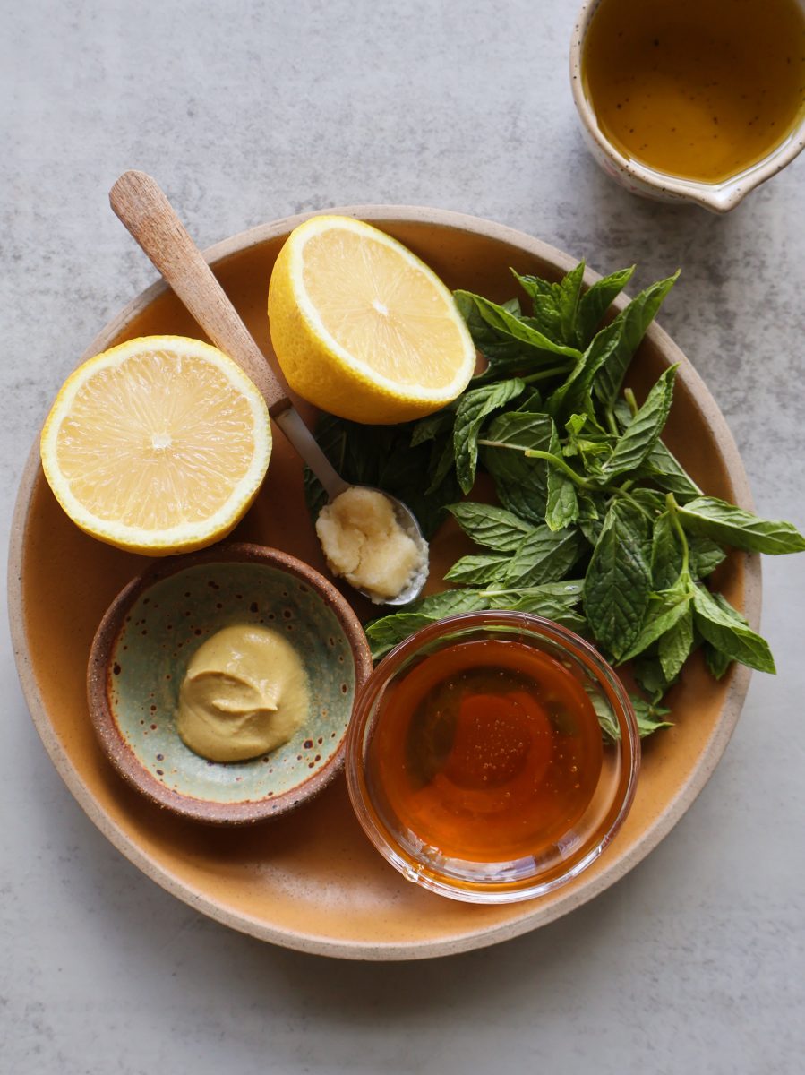 - Honey mint vinaigrette– a zesty dressing made from fresh mint, lemon juice, olive oil, honey, garlic, dijon mustard and pinch of salt