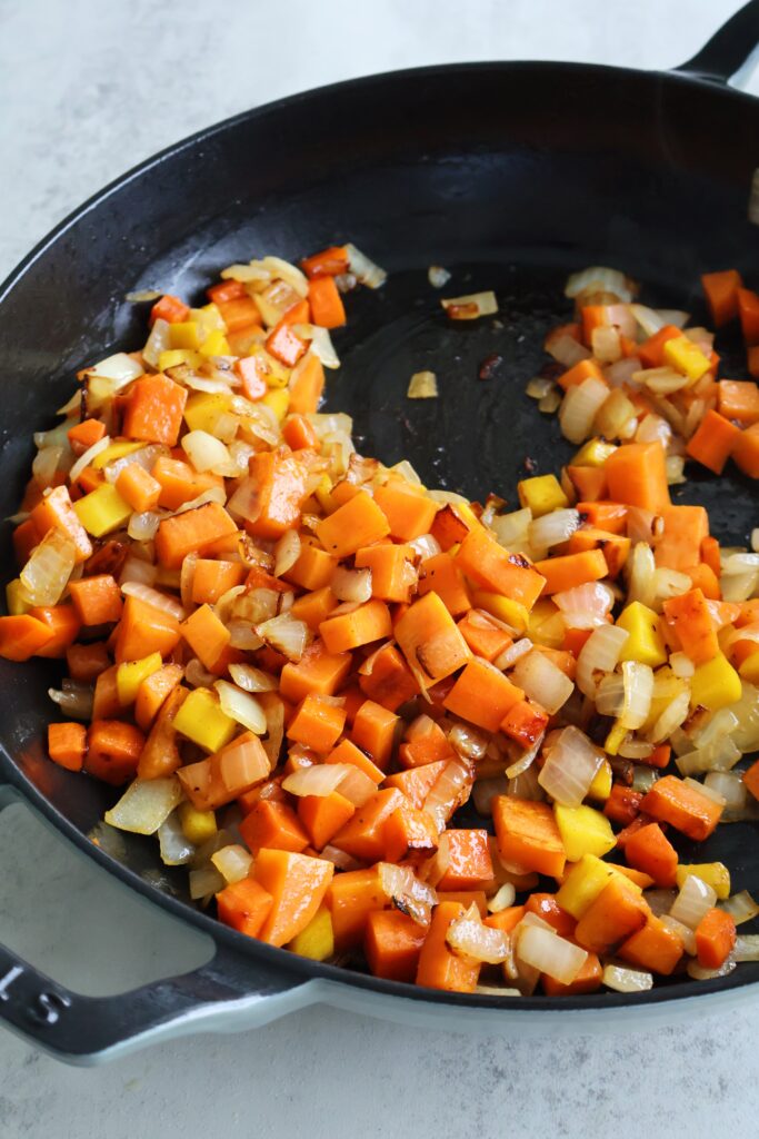 - Add the onion, diced carrots and sweet potato to the oil. Saute together for 8-10 minutes, tossing every couple of minutes.