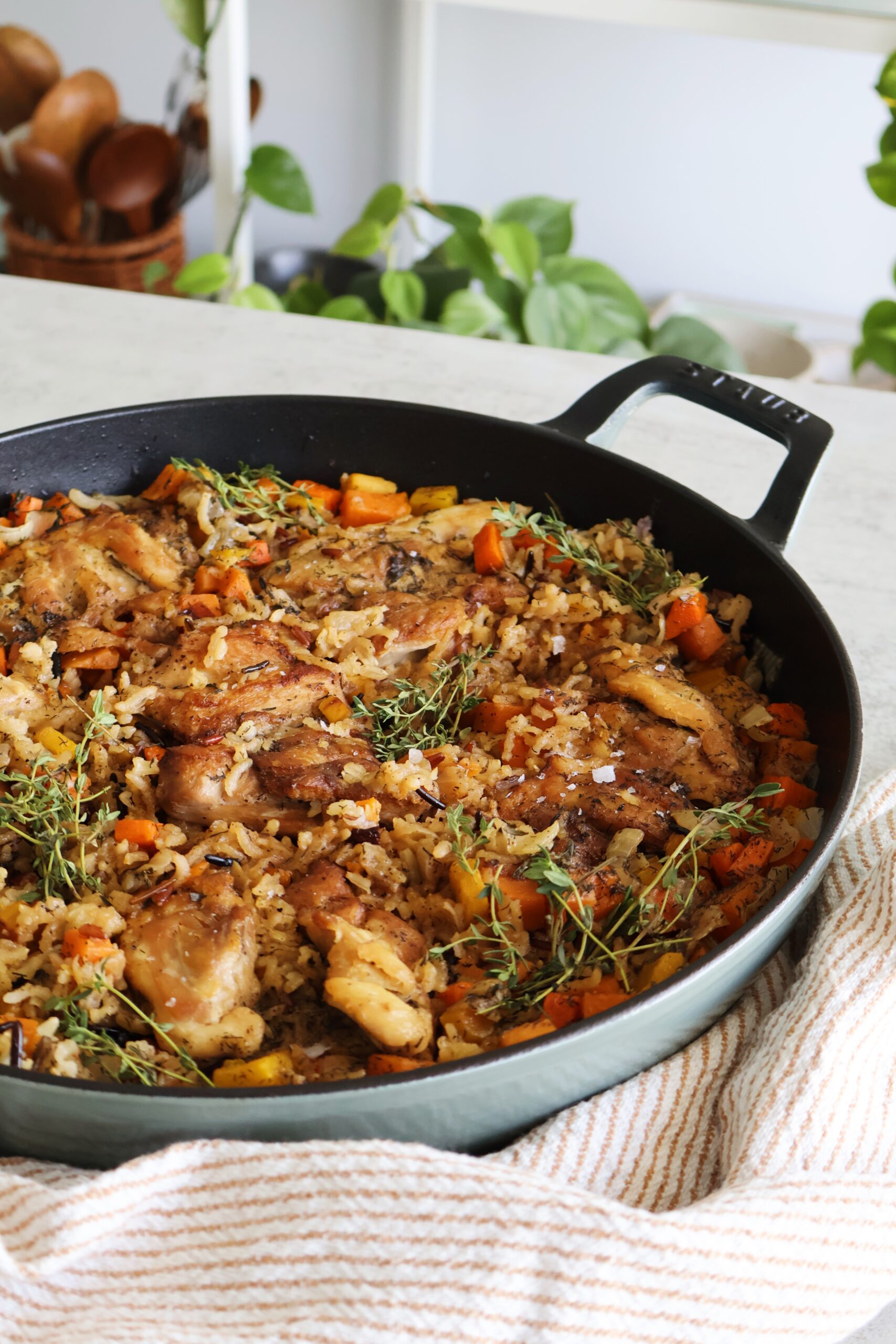This nourishing chicken and wild rice skillet is the perfect fall & winter dish. It’s full of hearty ingredients like a wild rice blend, carrots, sweet potatoes and onion cooked in a spice blend with broth and pan-seared chicken thighs.