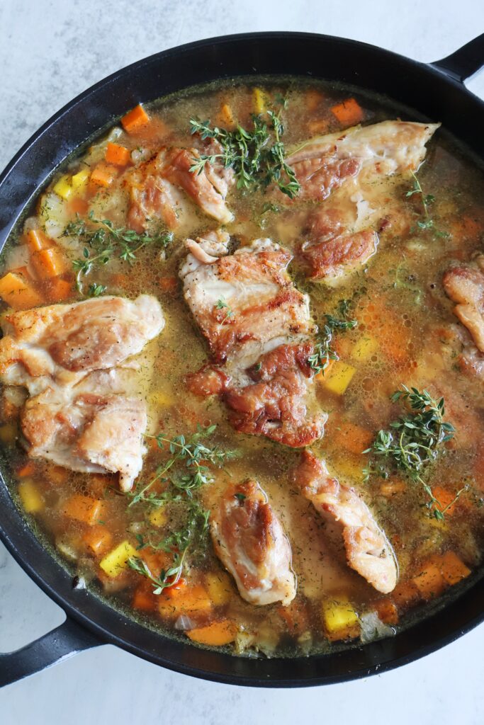 - Start by searing the chicken thighs in oil until browned on both sides, then setting them aside