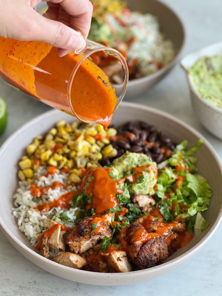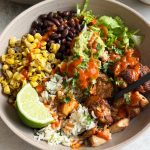 You can easily make these bowls plant-based by swapping out the chicken for tofu, like in my tofu burrito bowls. You can serve this on a bed of rice or lettuce, eat it with tortilla chips, or add the fillings to a tortilla and make your own burrito.