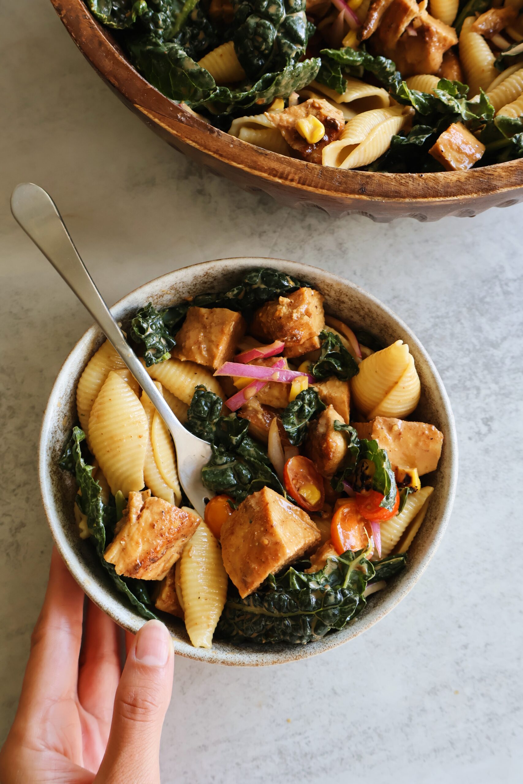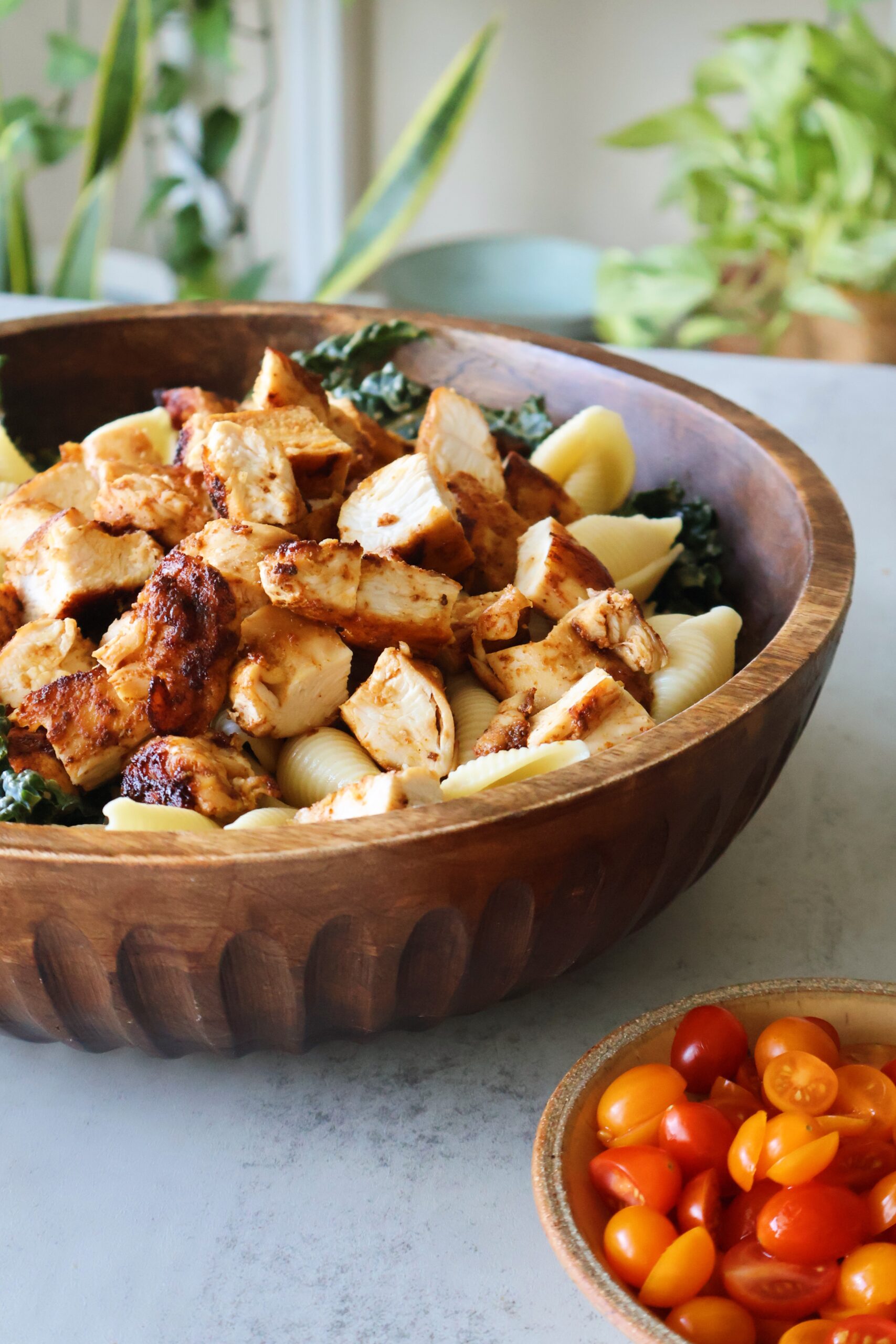 Seasoned chicken breast are grilled then chopped into bite sized pieces and tossed with cooked pasta, kale, corn and onion. Everything gets tossed in a creamy balsamic dressing and can be enjoyed cold or warmed.