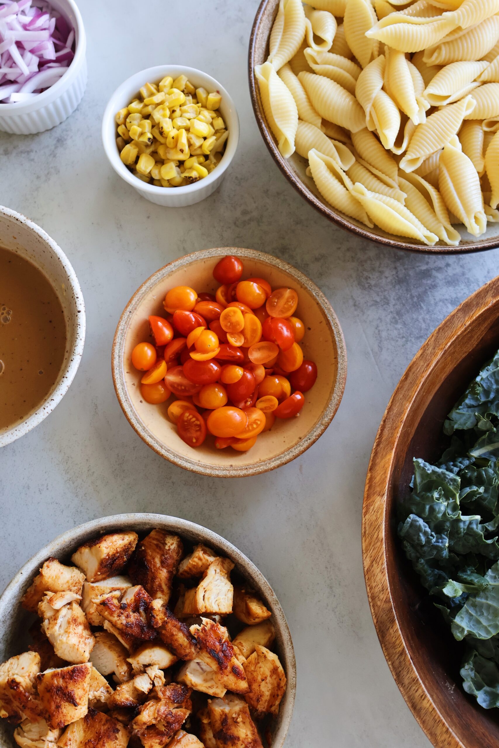 - Prepare the dressing and massage half of the dressing into the kale and onion salad. Top with the chicken, pasta, corn and tomatoes and mix with the remaining salad.