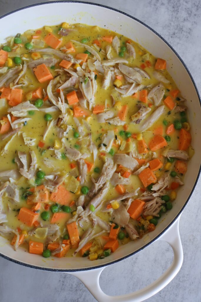 I’m all about the cozy recipes lately, and this puff pastry chicken pot pie will be on repeat all season. The base is made from a blend of frozen vegetables, sweet potatoes, and shredded chicken with a creamy seasoned sauce. It’s topped with flakey puff pastry and baked until golden for a crispy crust.