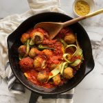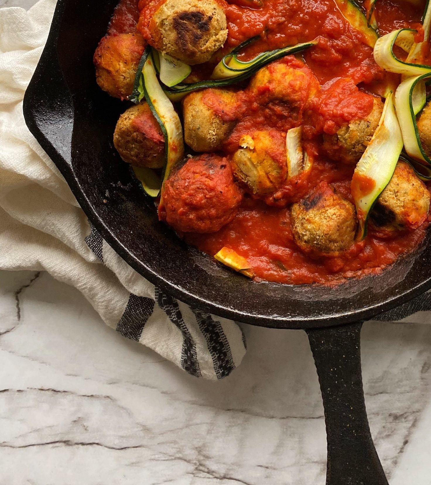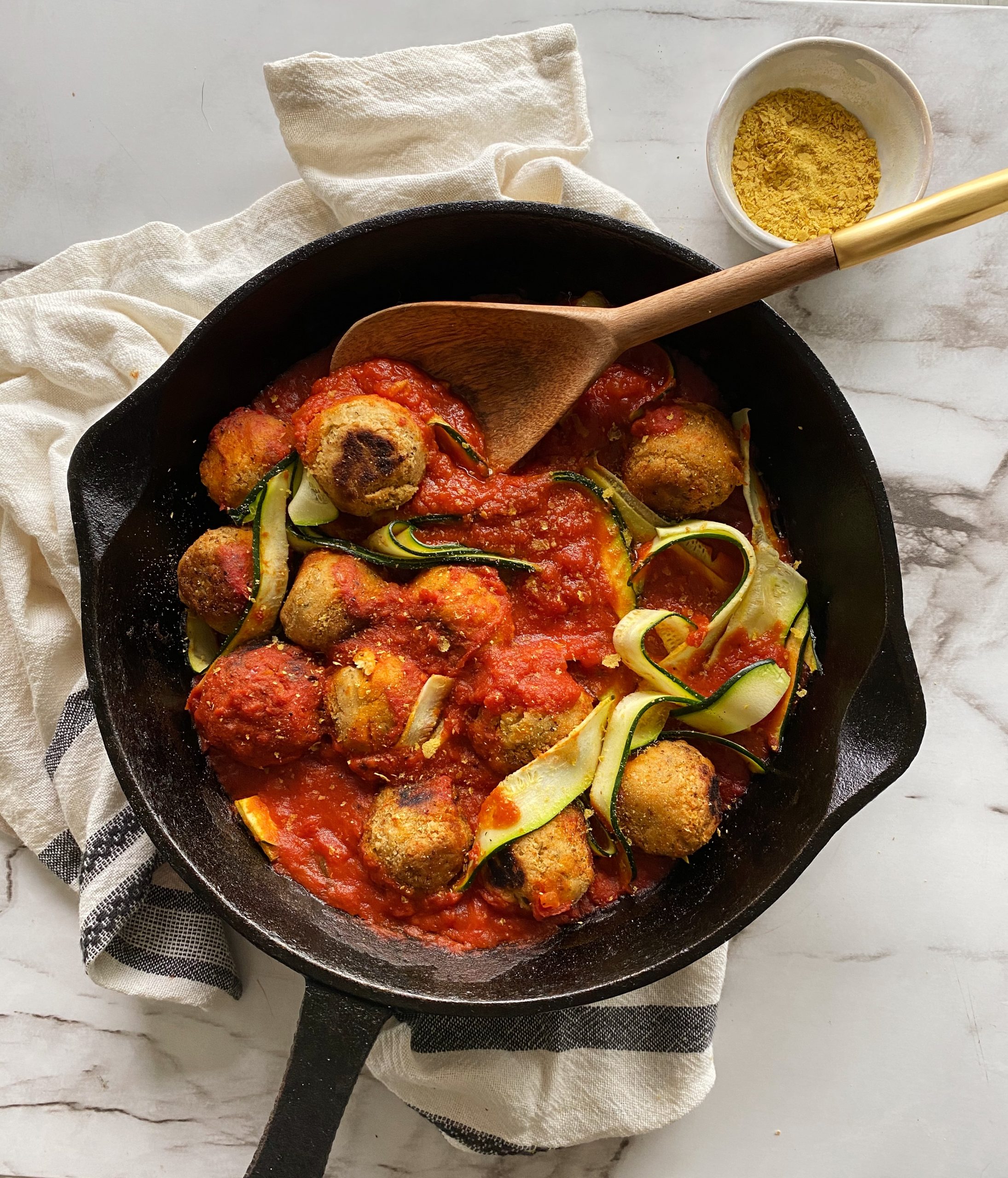 The flavor combo works so well together for these chickpea meatballs and zoodles. It’s a great way to pack in fiber, plant-based protein and tons of veggies! I like a thicker cut for my zoodles, so I used a vegetable peeler to shave them and then sliced them in half. All they need is a quick saute when you add the sauce and they’re ready to go.
