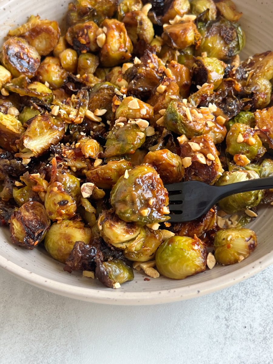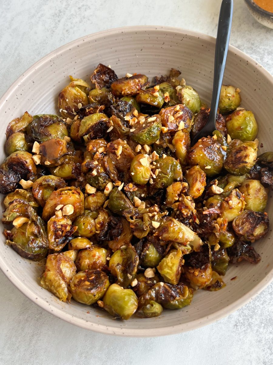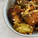 Spicy chili peanut roasted brussels sprouts are the perfect mix of sweet & spicy! They’re a delicious side dish to bring to your dinner table, and truly taste like they’re from a restaurant!