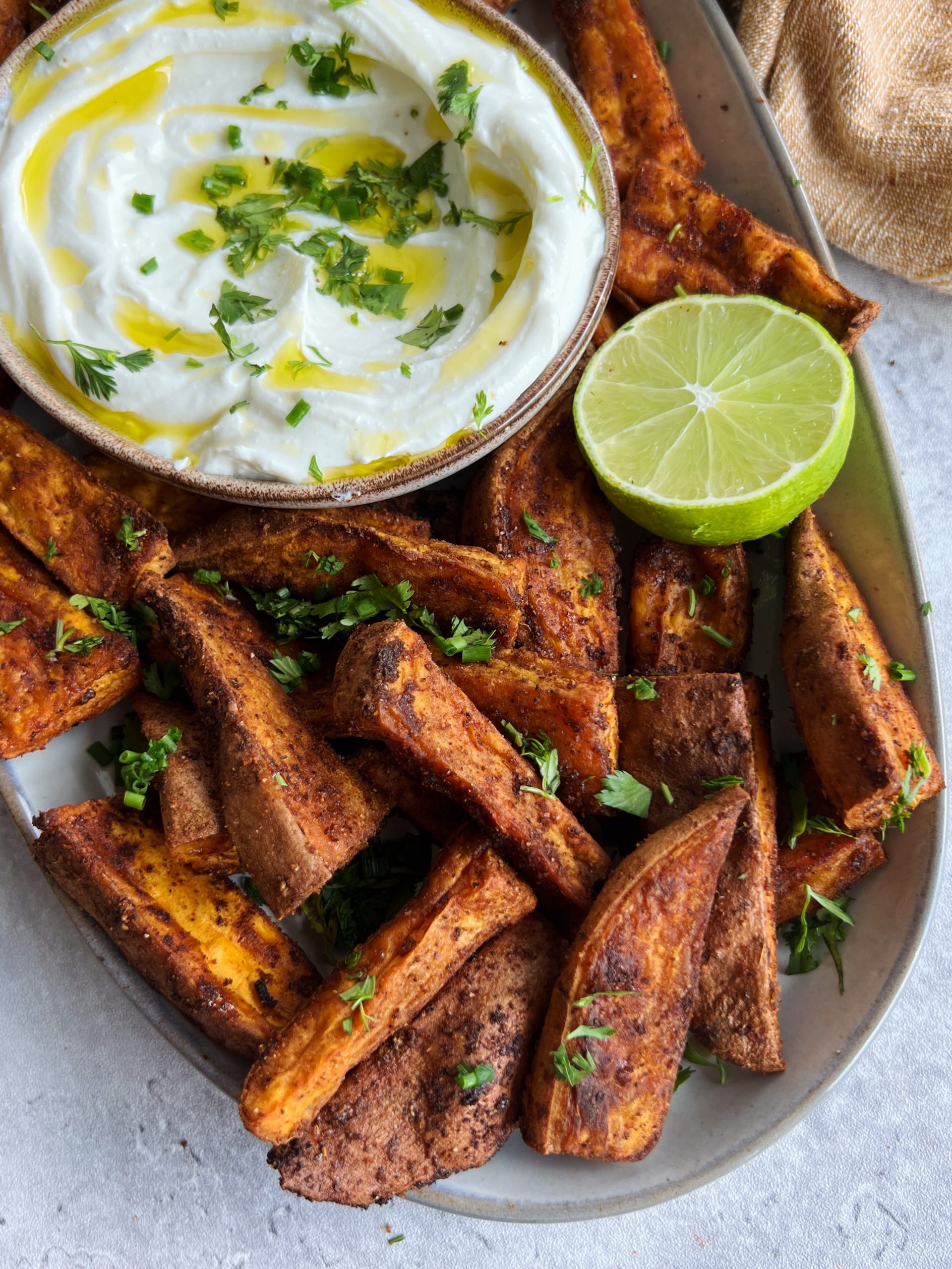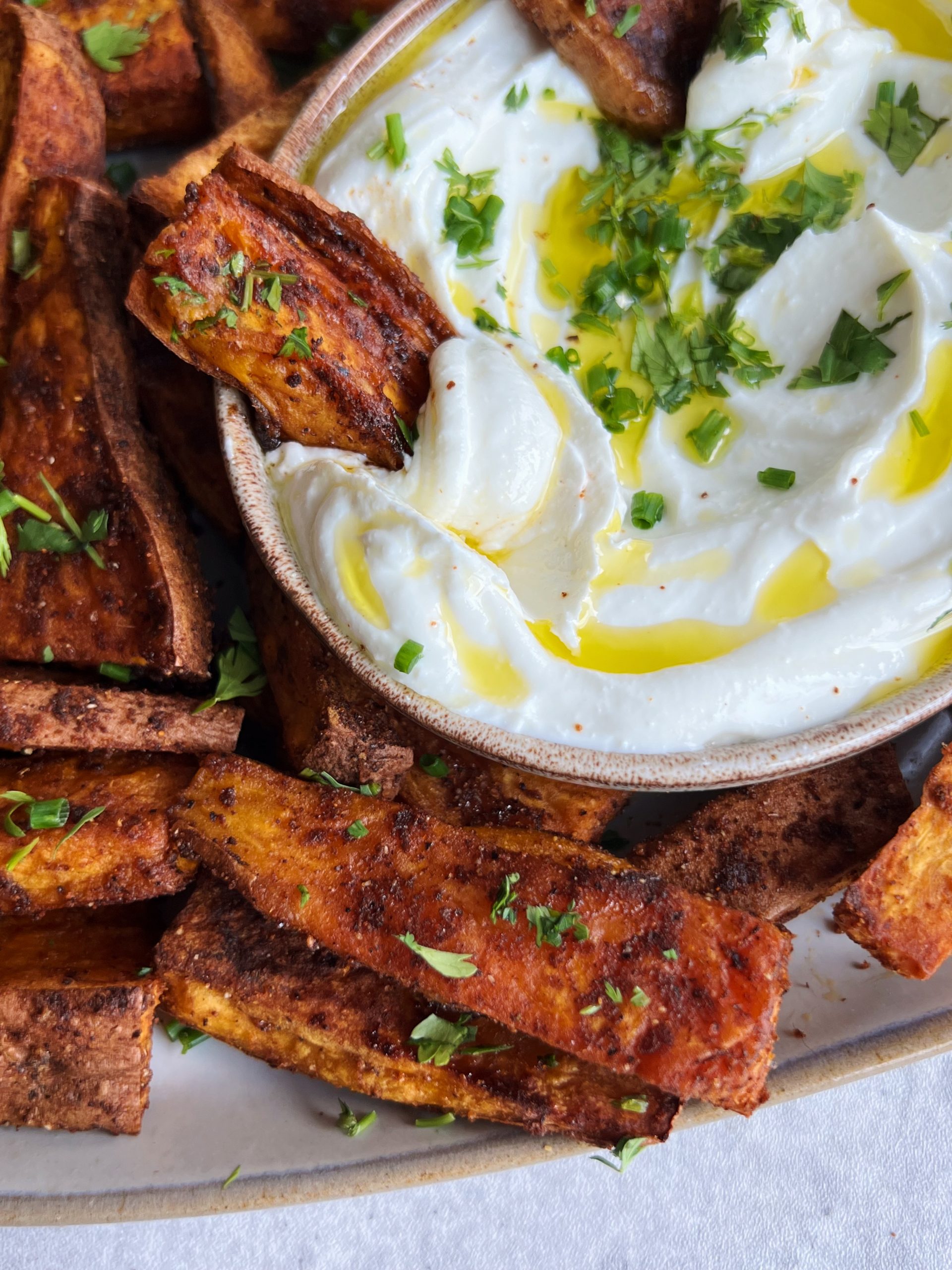 Sweet potatoes are rich in vitamins and nutrients and can be prepared in so many ways. I love them roasted in the oven with a few simple seasonings, and they taste even better paired with a creamy whipped feta dip.