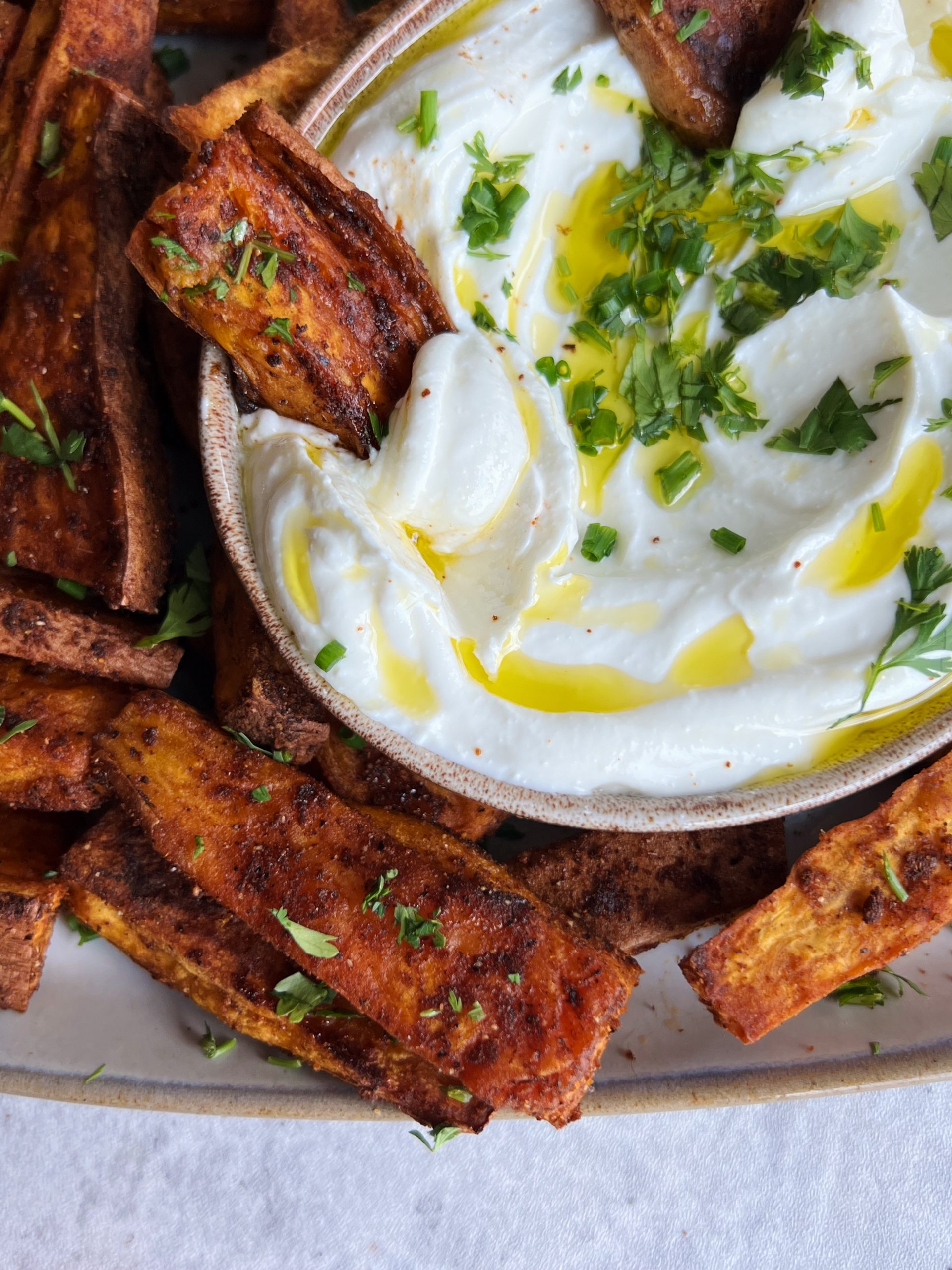 You can serve whipped feta as a dip with these sweet potato fries, or as an appetizer served with warm bread and fresh veggies.