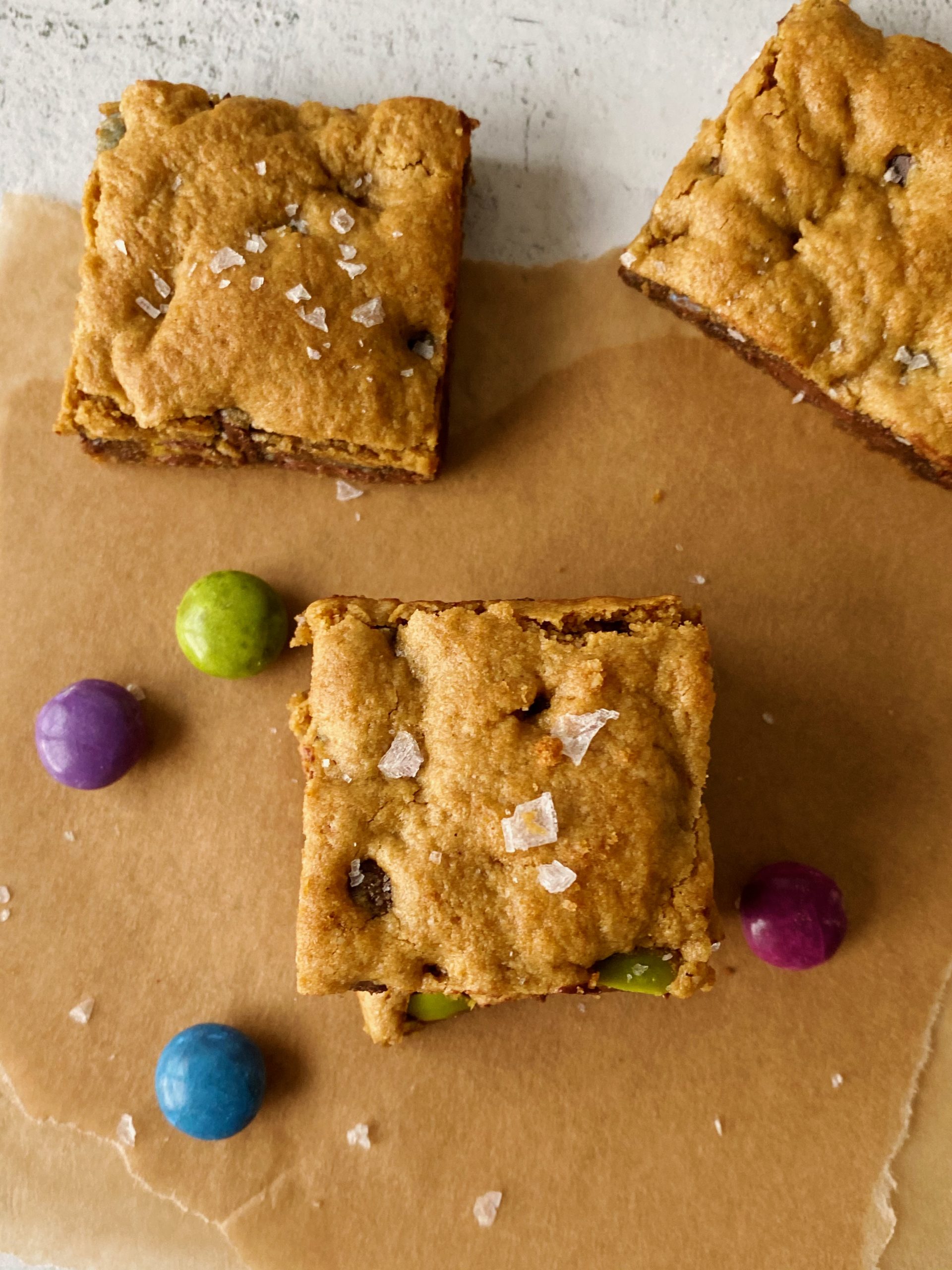 When it comes to dessert, I like having something quick to grab when that craving hits. These cookies bars are a delicious sweet fix to keep around during the week, and can be filled with any fix-ins of your choice!