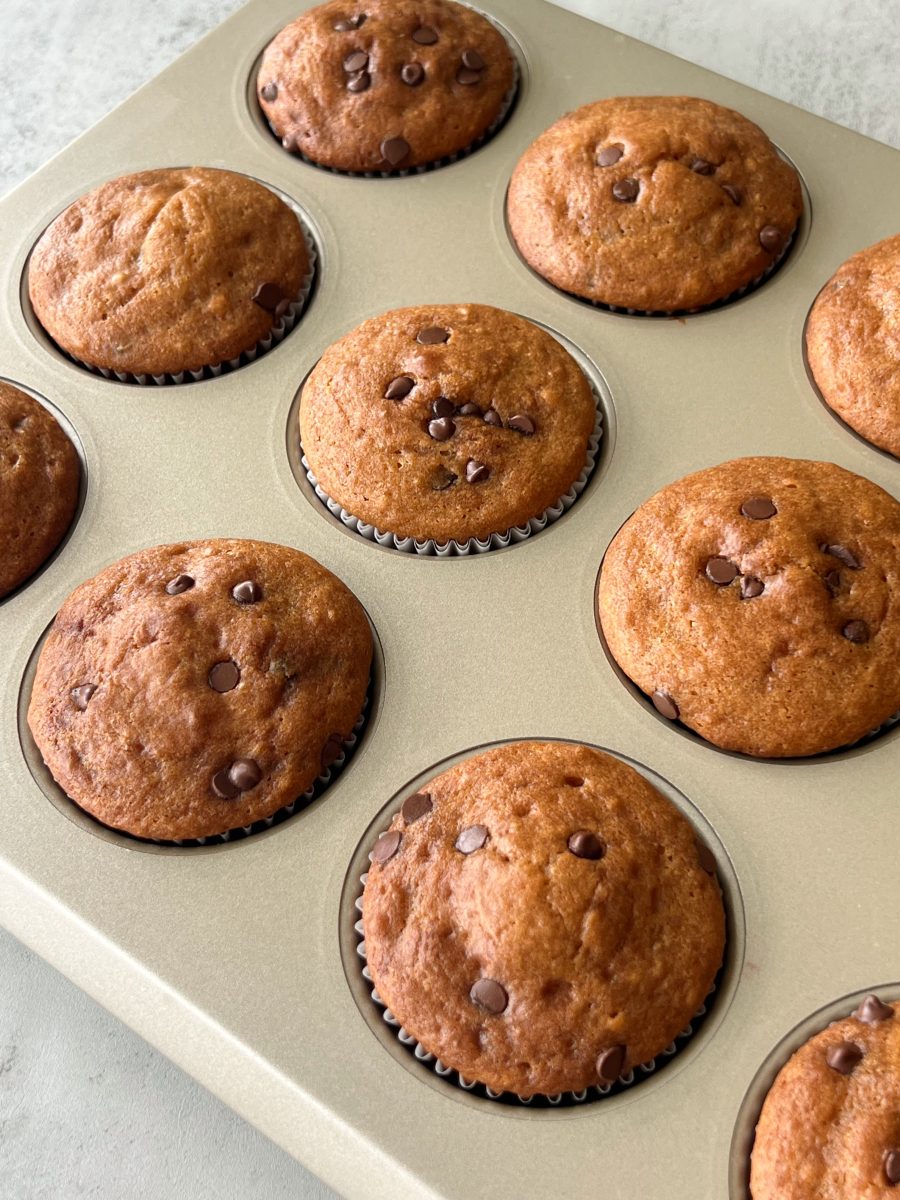 - Line a muffin tray with muffin liners and scoop about 3 tbsp of batter into each cup. Top them off with extra chocolate chips.