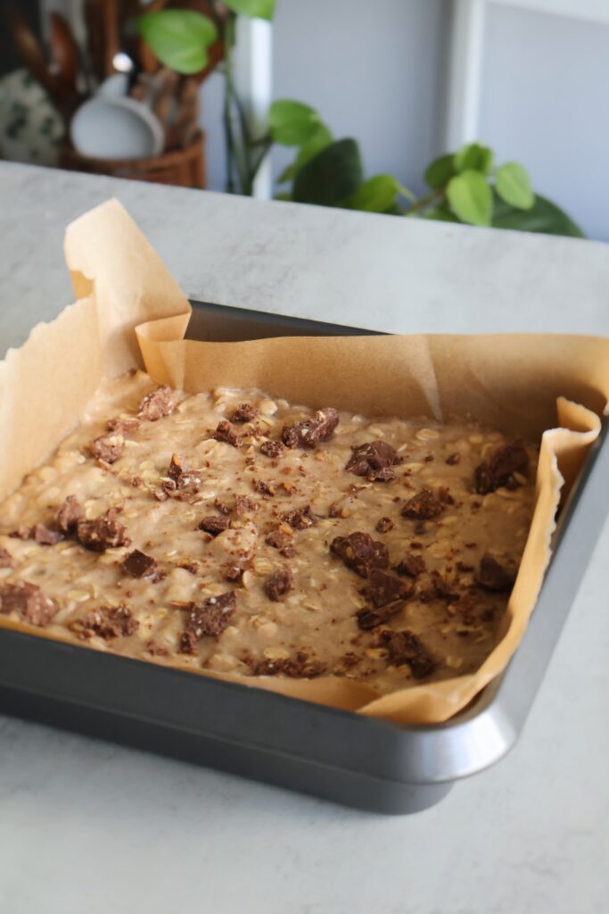 - Transfer the batter to an 8 x 8 parchment lined baking pan.