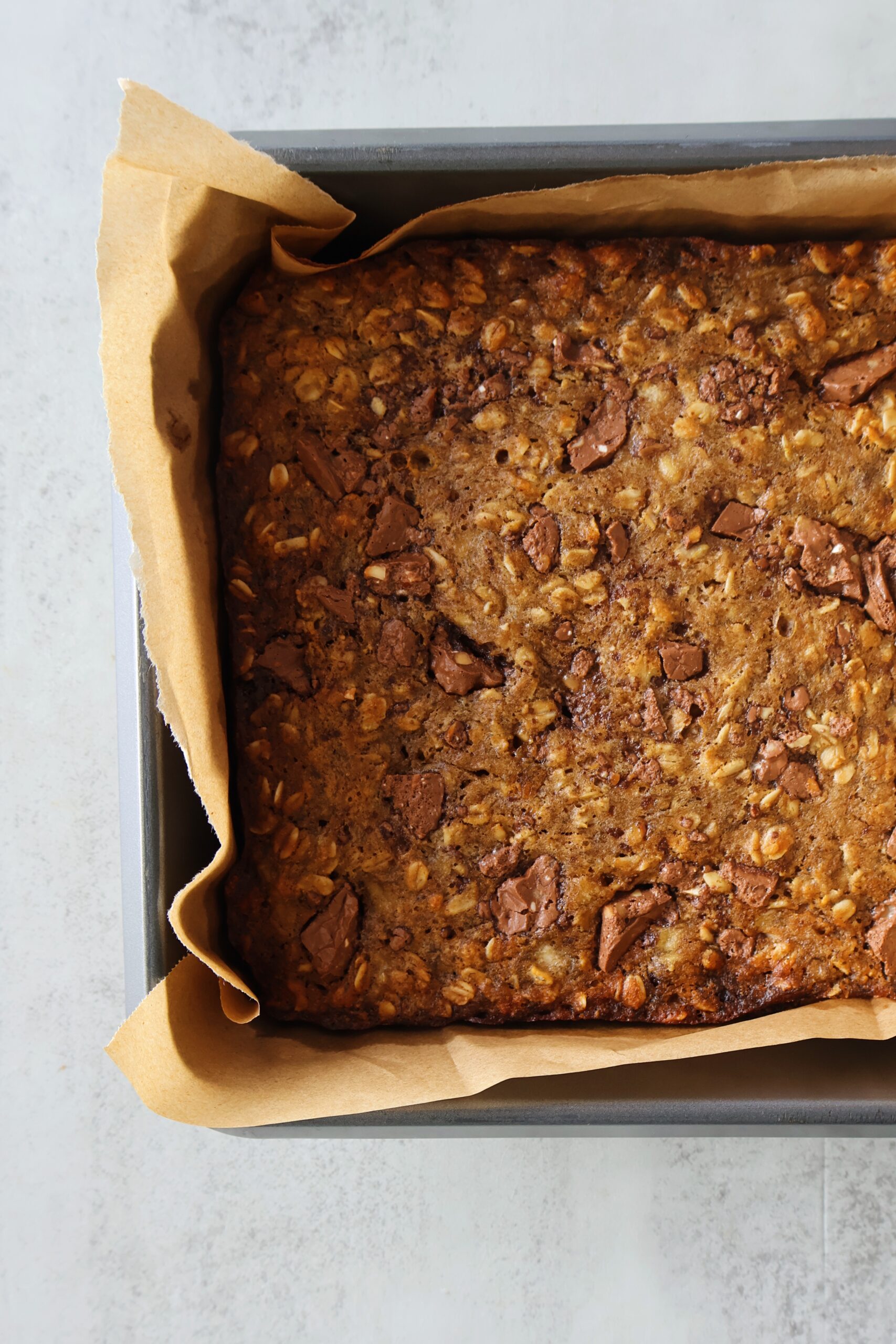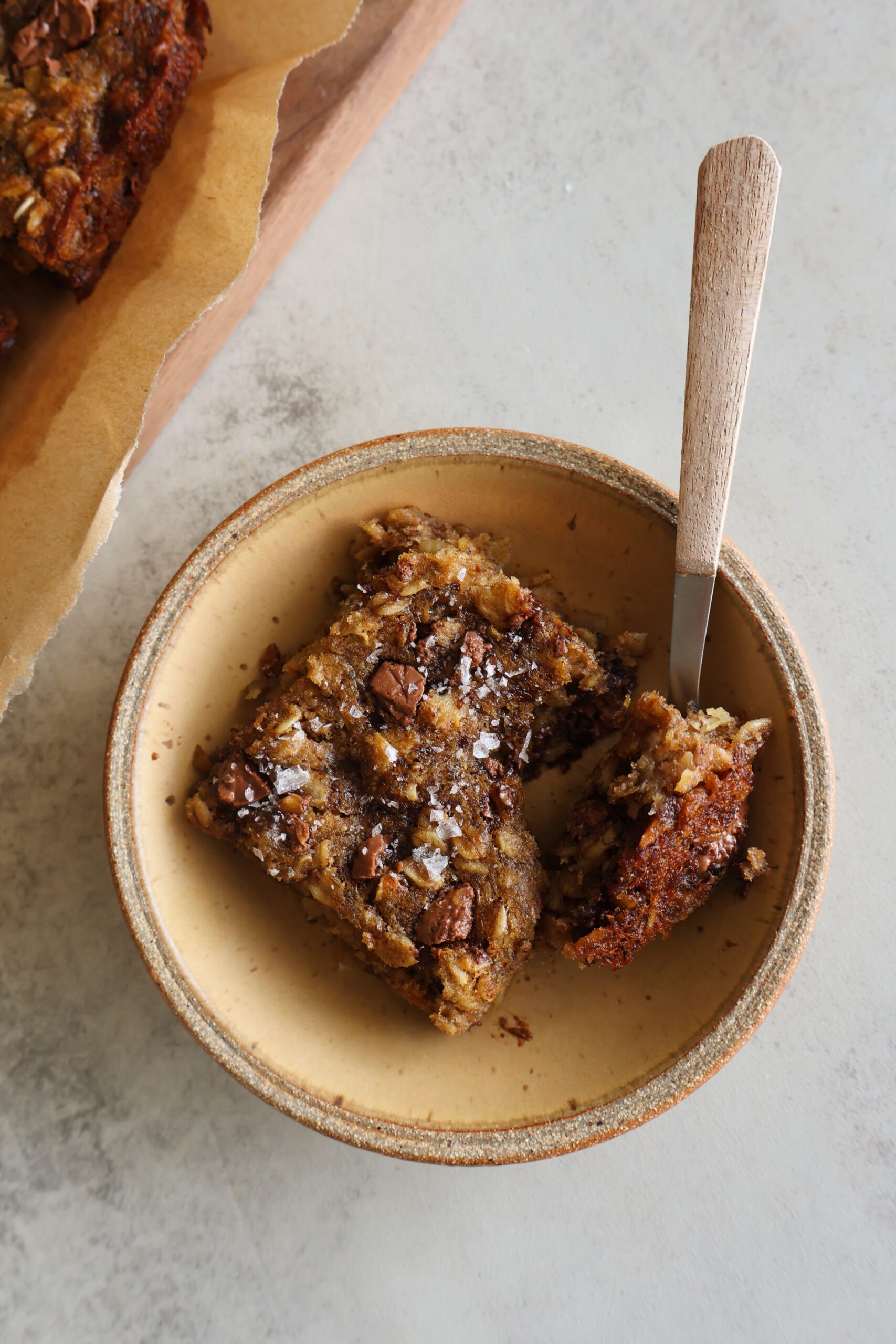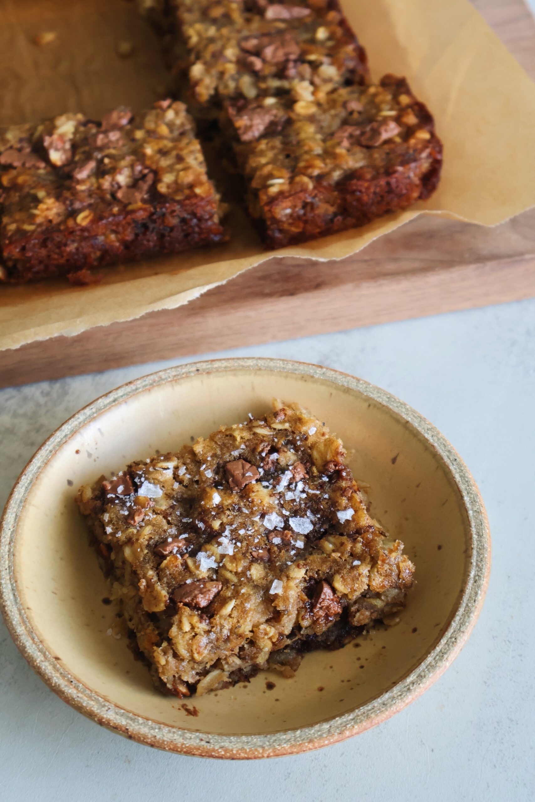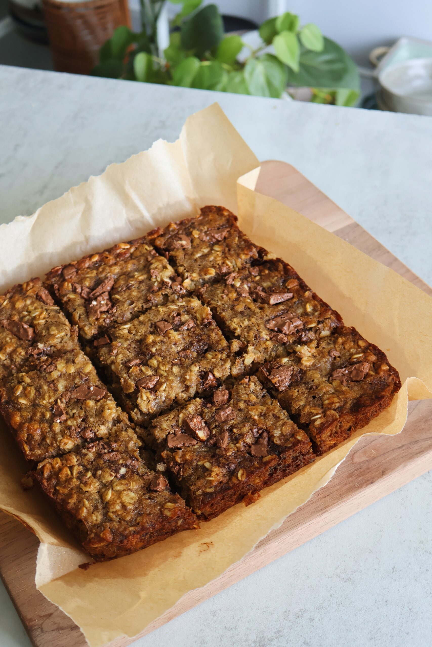 These bars have all the flavors of banana bread, but are lower in sugar and higher in fiber. They’re a great make ahead option for busy weeks, and leave your house smelling like a bakery. I love to pair them with a side of fruit, eggs, or yogurt for a completely balanced meal.