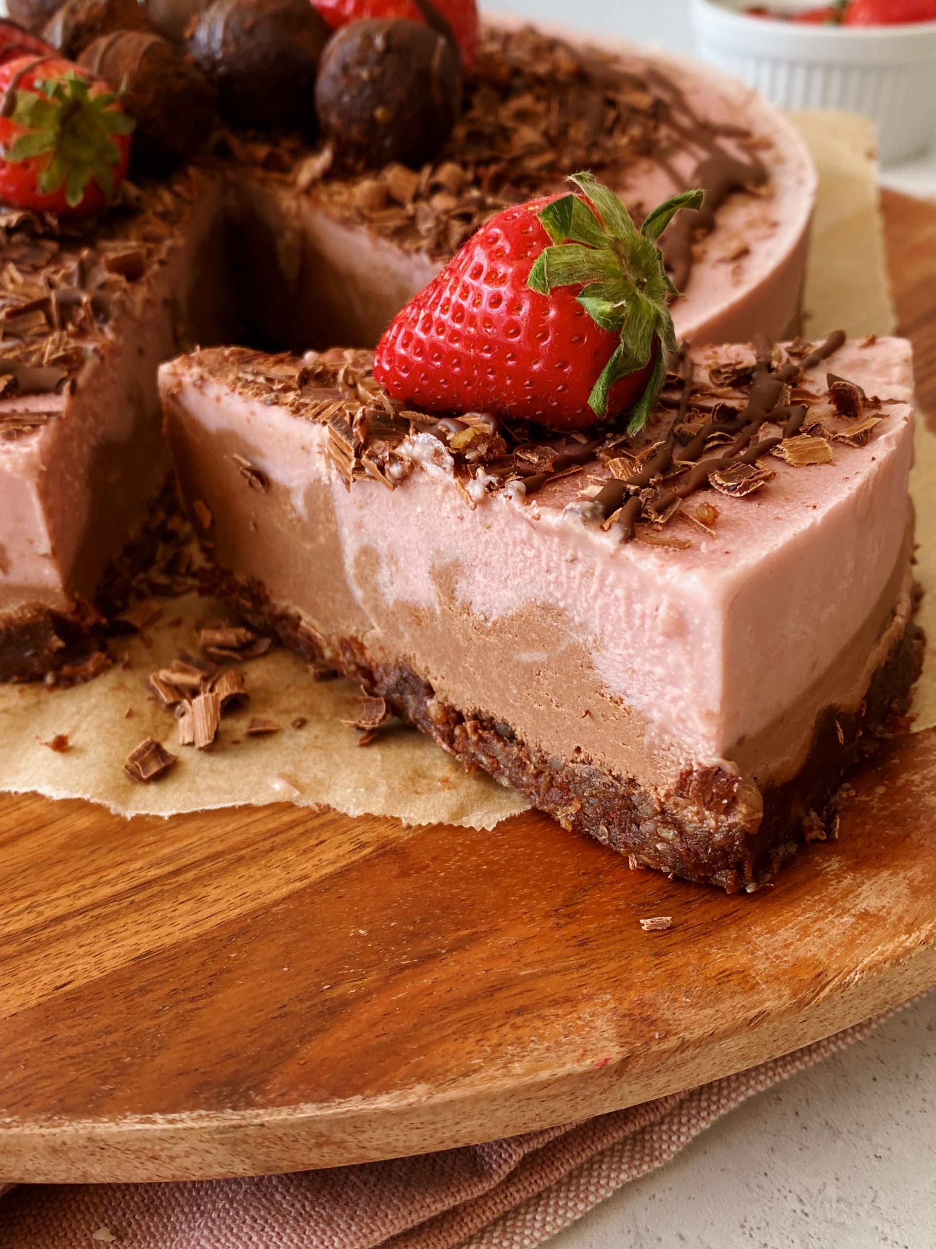 I love to reserve some of the crust mixture to make little date balls to top the cake with. It seriously has the most decadent chocolate strawberry flavors- similar to a chocolate covered strawberry!