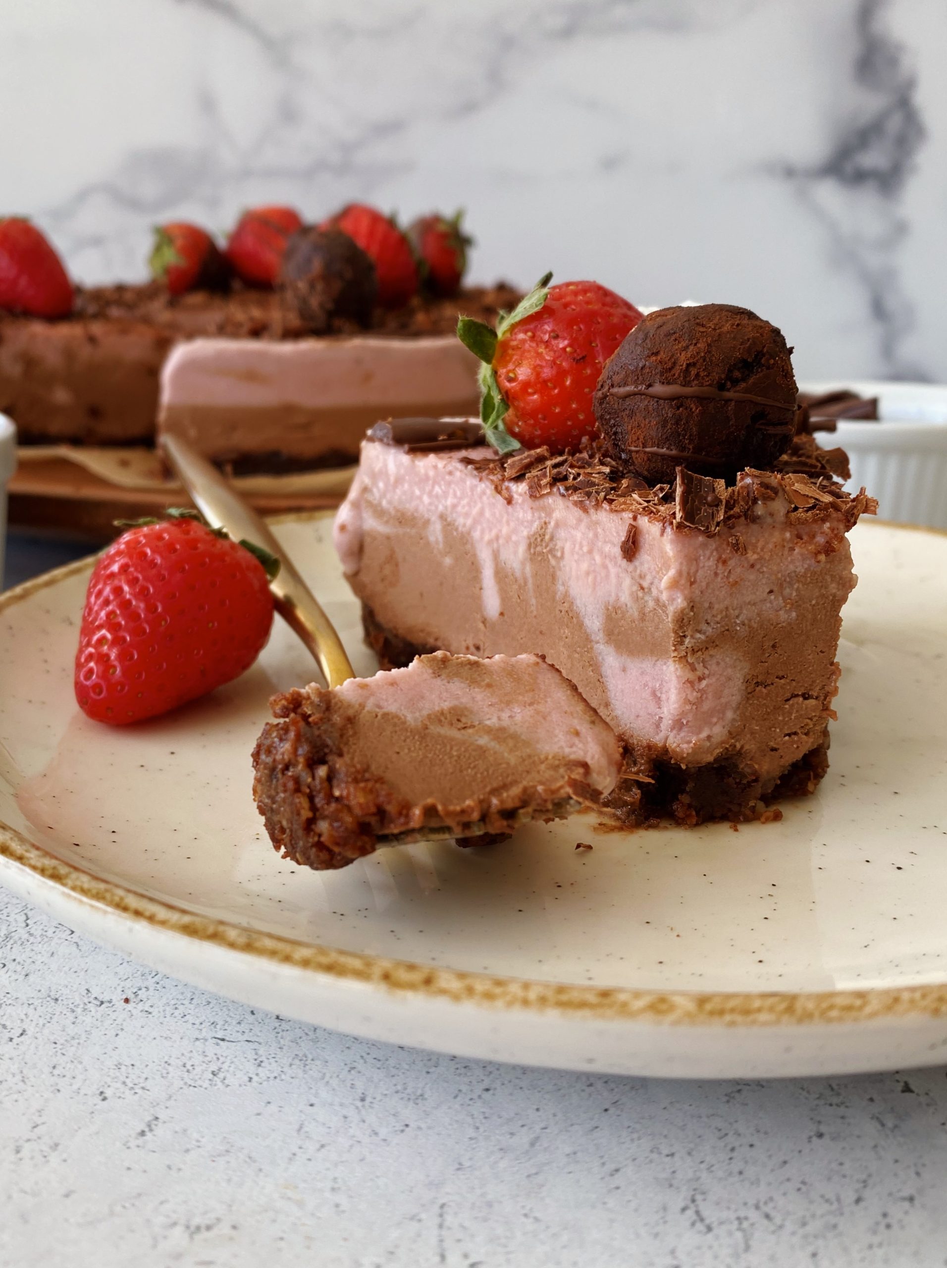 It’s naturally plant-based, and made with a date/nut crust. The filling resembles a cashew-based ice cream filling, and it has swirls of chocolate and strawberry flavors in every bite.