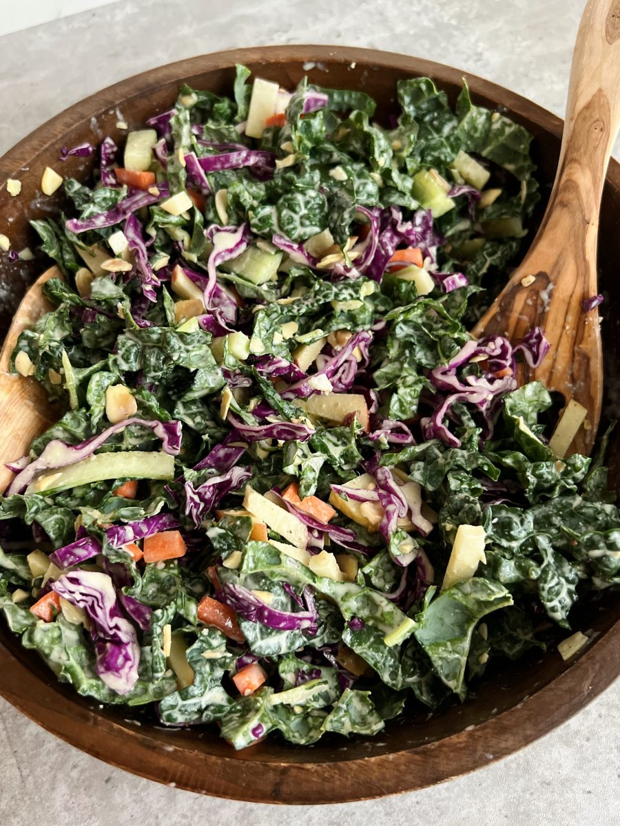 Kale is the superior green base to use for any salad in my opinion. It stays crisp when marinated, and works well with a variety of different dressings and flavors.