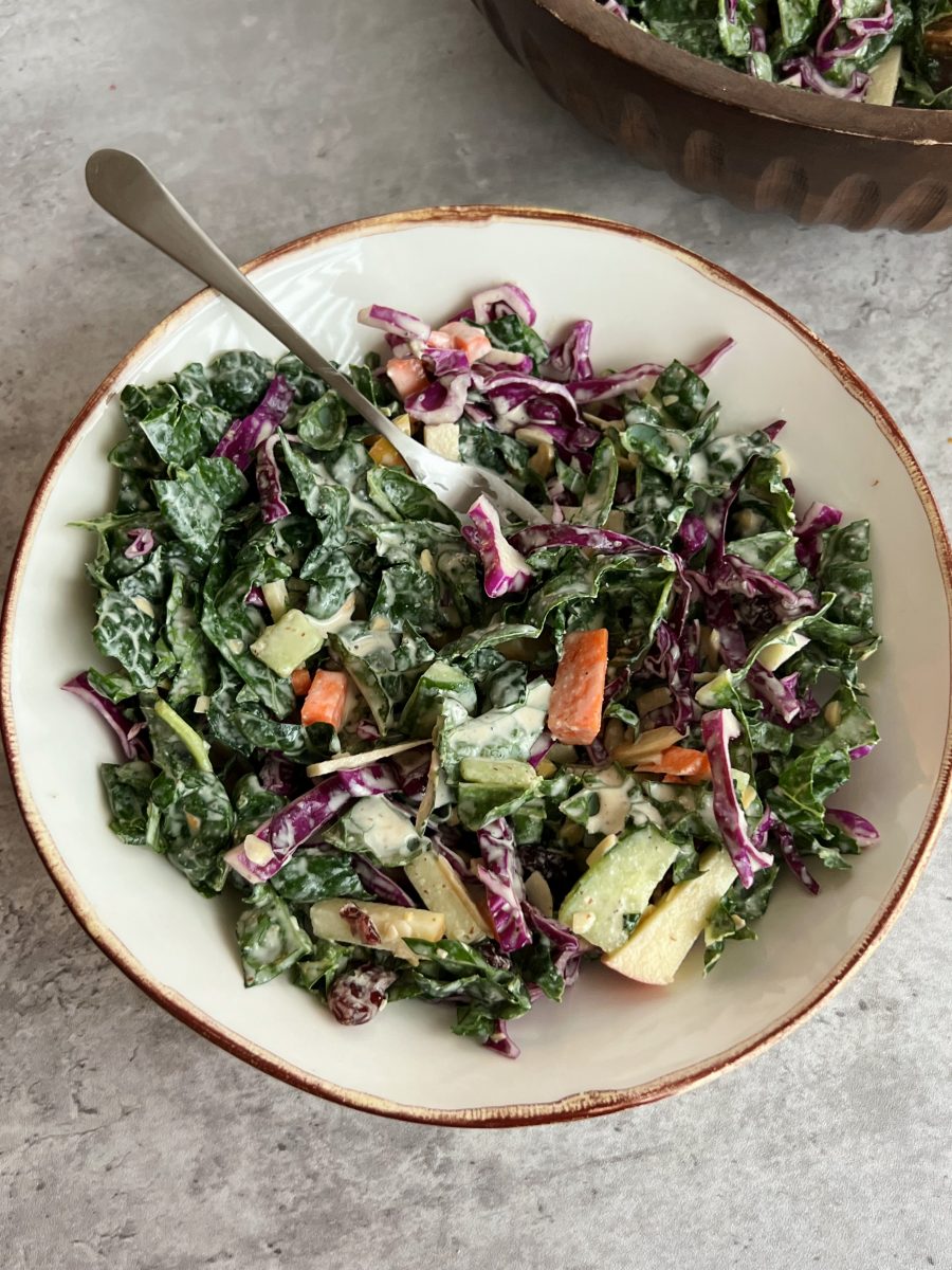 This chopped kale salad is tossed in a creamy sesame tahini dressing, and topped with crunchy veggies like cabbage, carrots and cucumbers. The apple slices and dried cranberries add the perfect sweetness, and the shaved almonds add a delicious crunch.