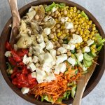 The jarred roasted red peppers and marinated artichokes add the most delicious flavor to the salad, so I highly recommend adding those in!