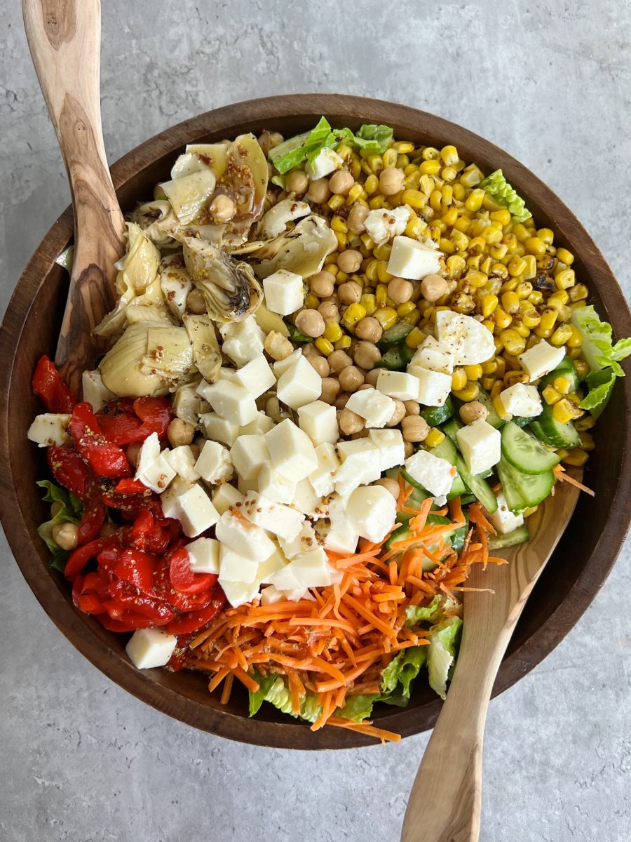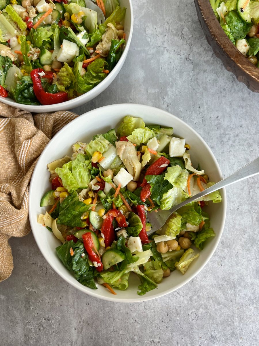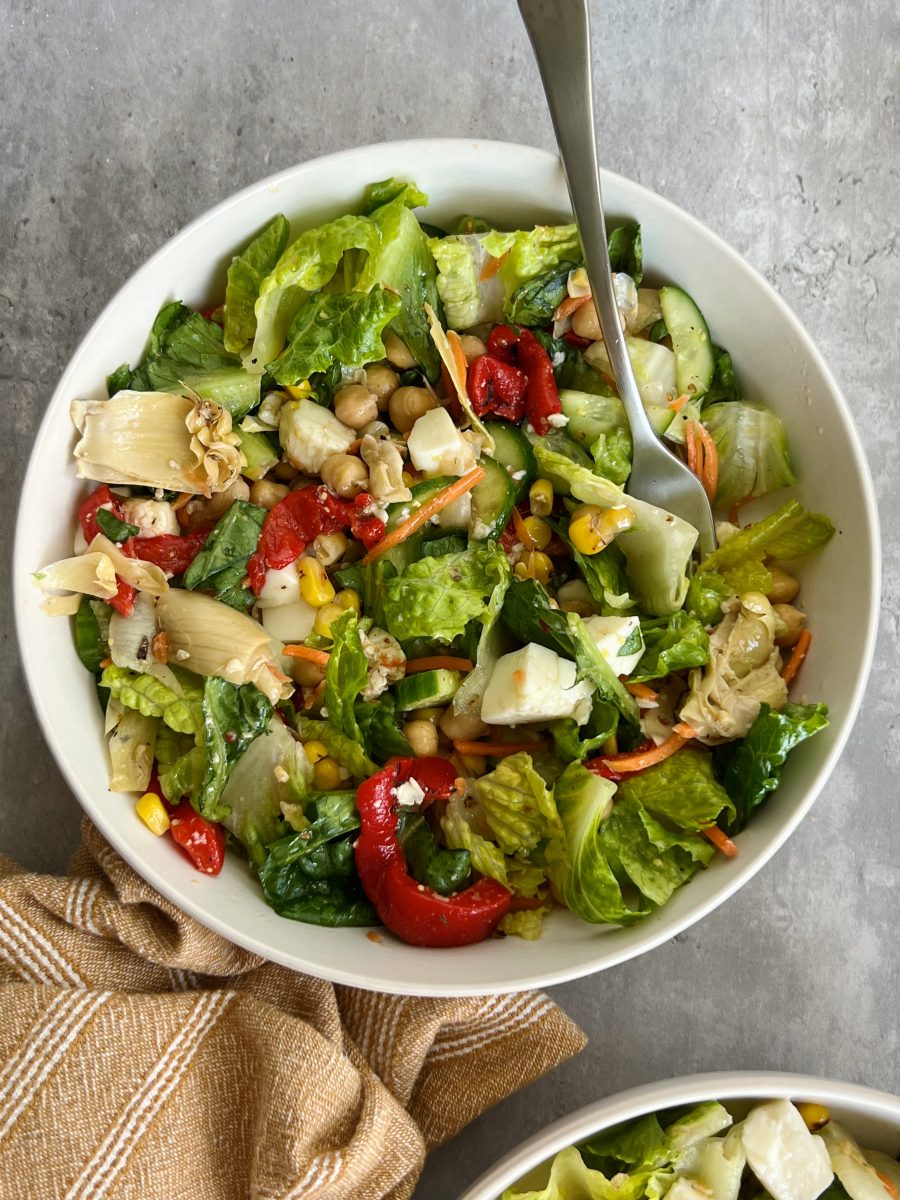 This veggie chopped salad was inspired by the Italian antipasto salad, but made vegetarian with a few additional ingredients, like corn and chickpeas. It’s crisp and crunchy, and can be served as its own meal or with your favorite protein side.