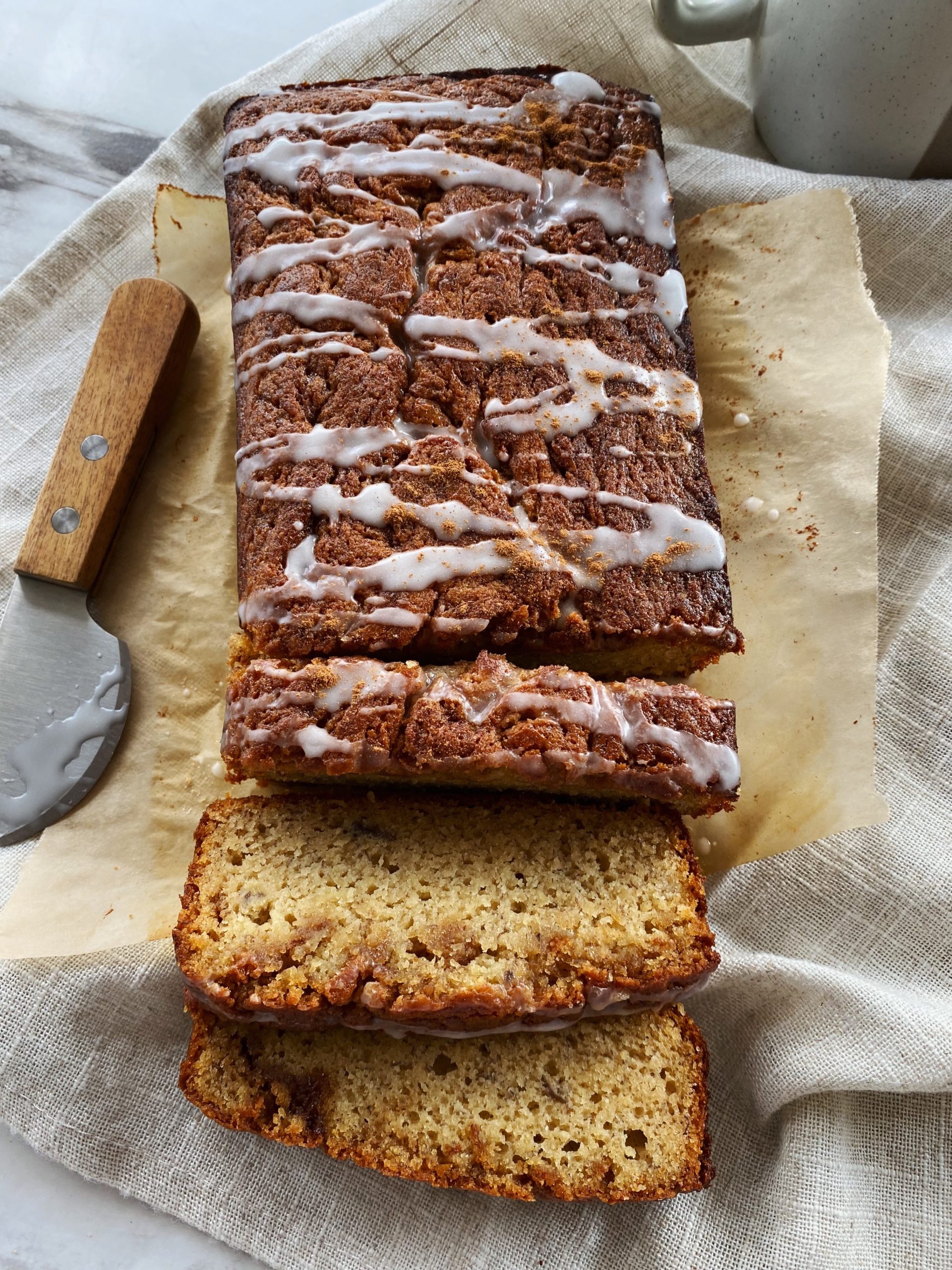 - Let cool for 10-15 minutes. Mix the icing ingredients together until thick, and drizzle over the bread. Top with a sprinkle of cinnamon.