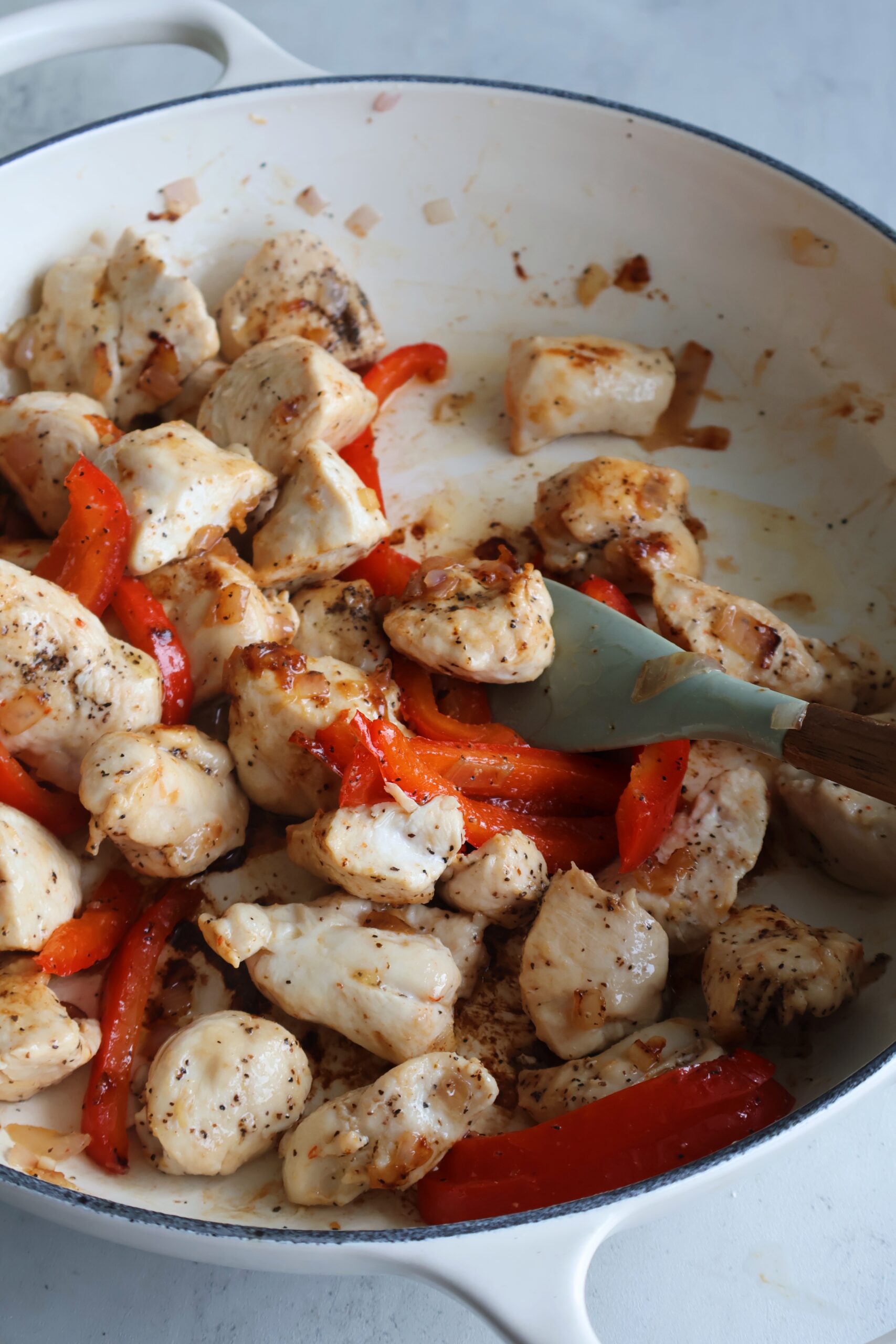 - Add in the cubed chicken seasoned with salt & pepper, and the sliced red bell pepper. Cook together on medium heat for 15 minutes to brown the chicken