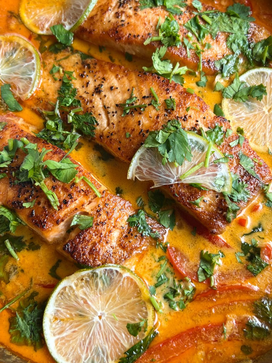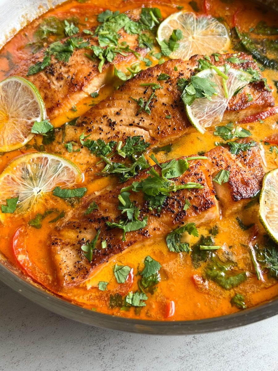 Seasoned salmon fillets are seared in olive oil, then cooked in a red curry sauce made with coconut milk, aromatics, and some added veggies. The salmon stays tender and absorbs all of that delicious sauce.