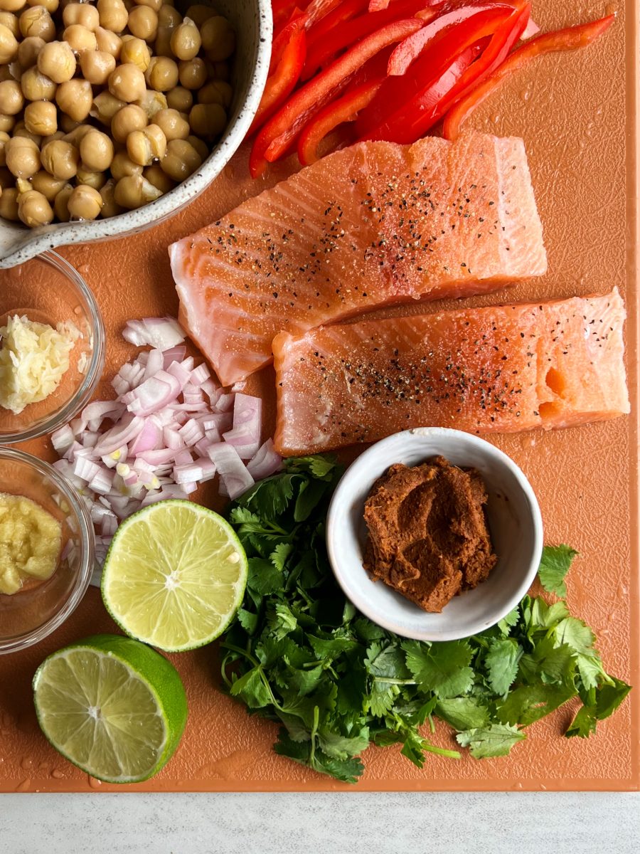 So delicious and filling! I didn’t have red curry paste so I subbed gochujang – super yummy! I also accidentally bought salmon with skin but discarded the skins before cooking the veggies. Definitely will be making this one again.