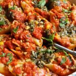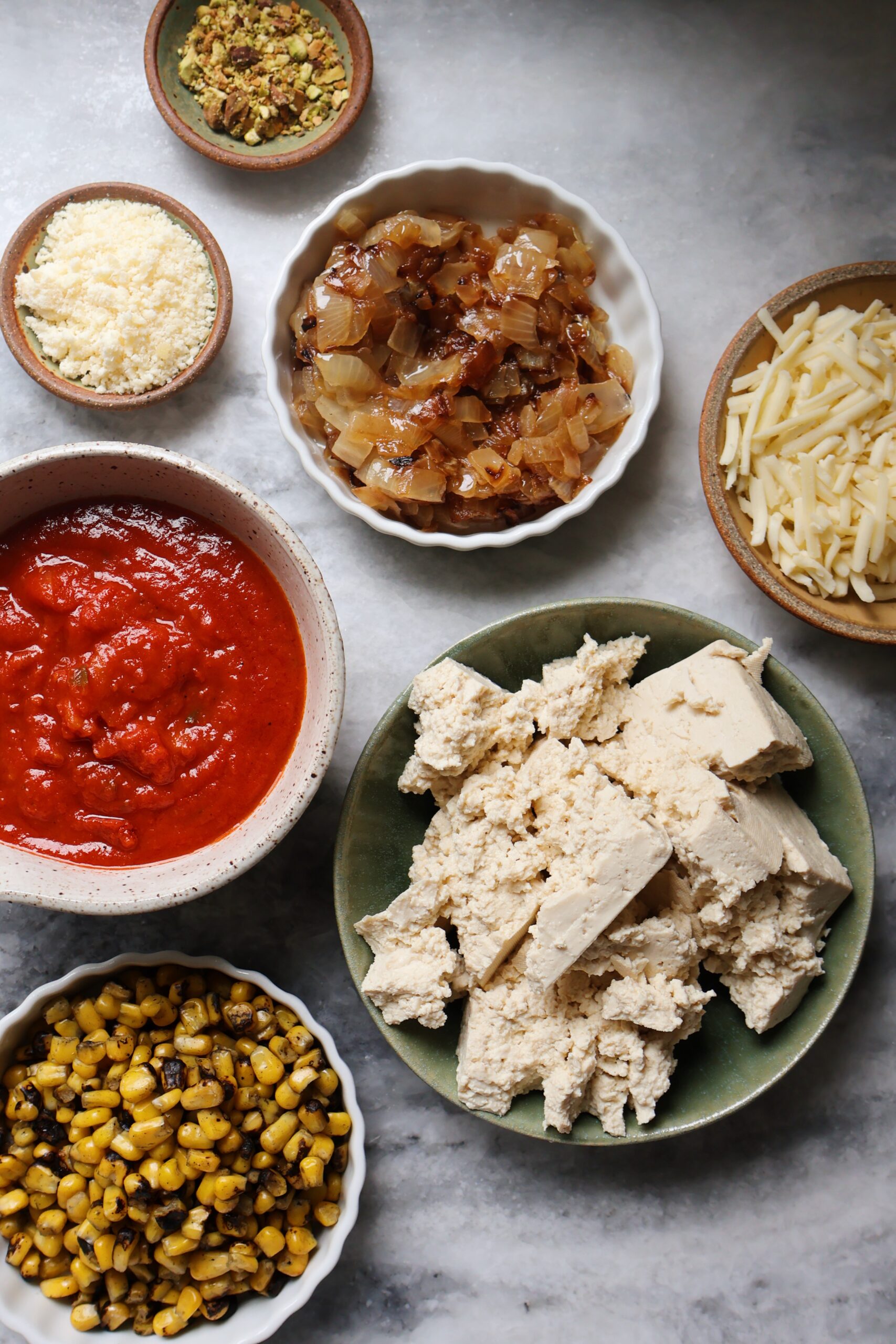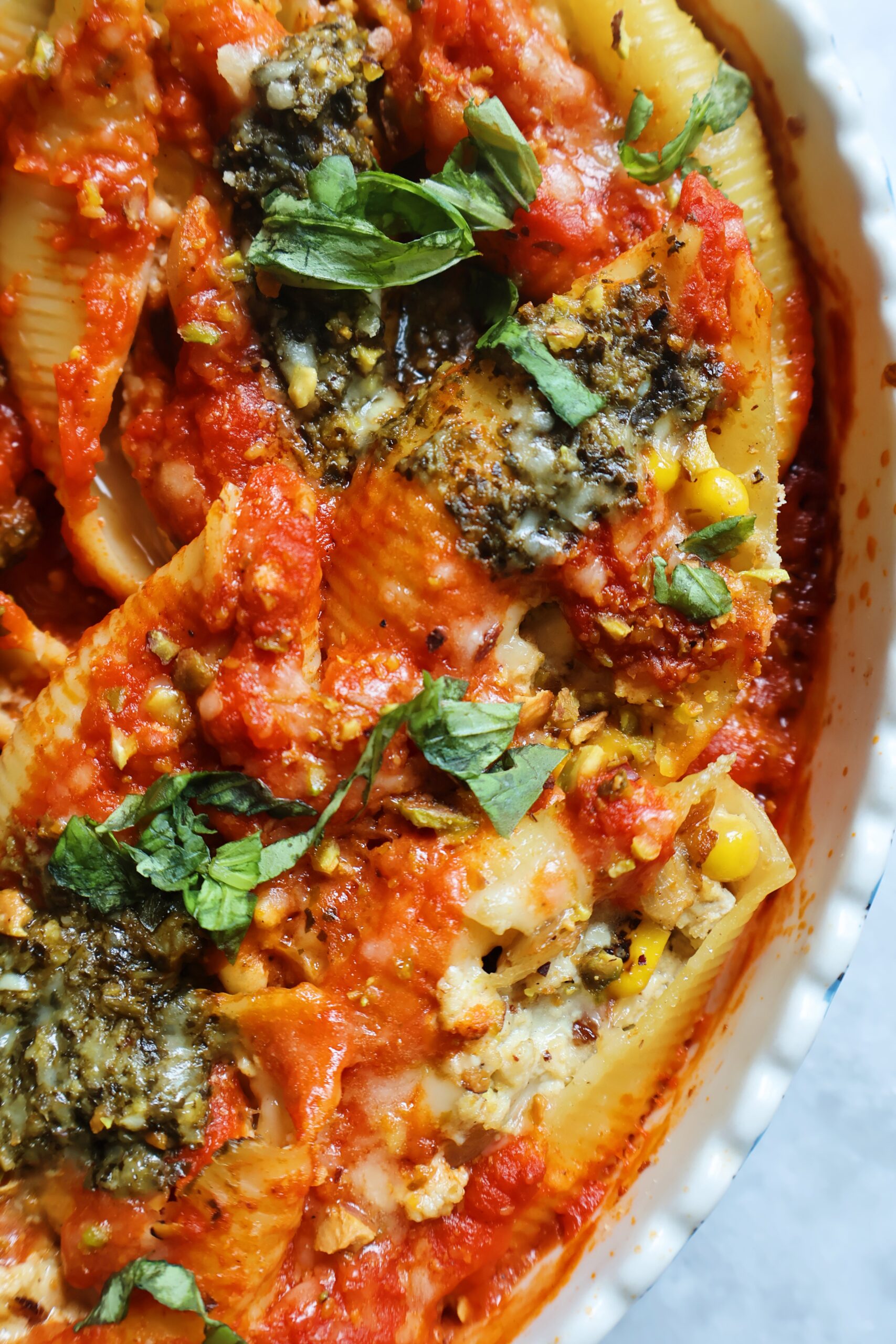 Corn & caramelized onion stuffed shells made with a cheesy tofu filling and topped with marinara sauce, fresh basil and crushed pistachios.