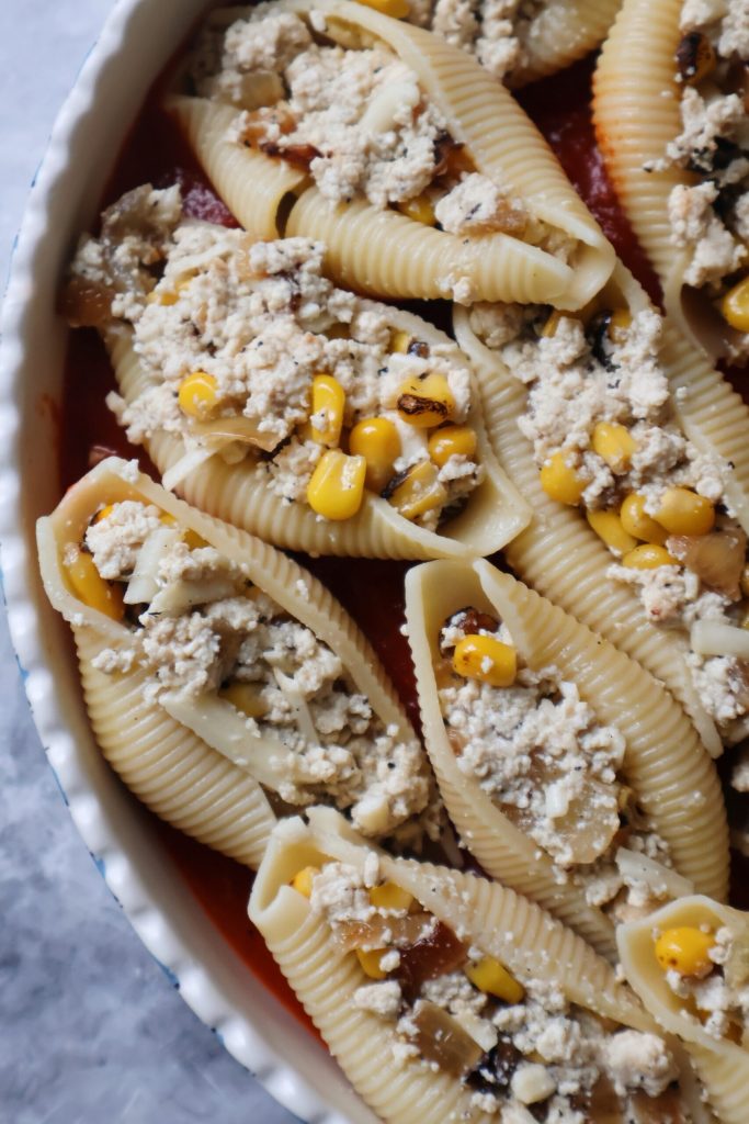 I used a tofu base for the filling to add a boost of protein to this recipe. The tofu gets mashed or blended and mixed with roasted corn, sauteed onions, shredded cheese and a few spices that then get stuffed into pasta shells and baked with marinara sauce and pesto.
