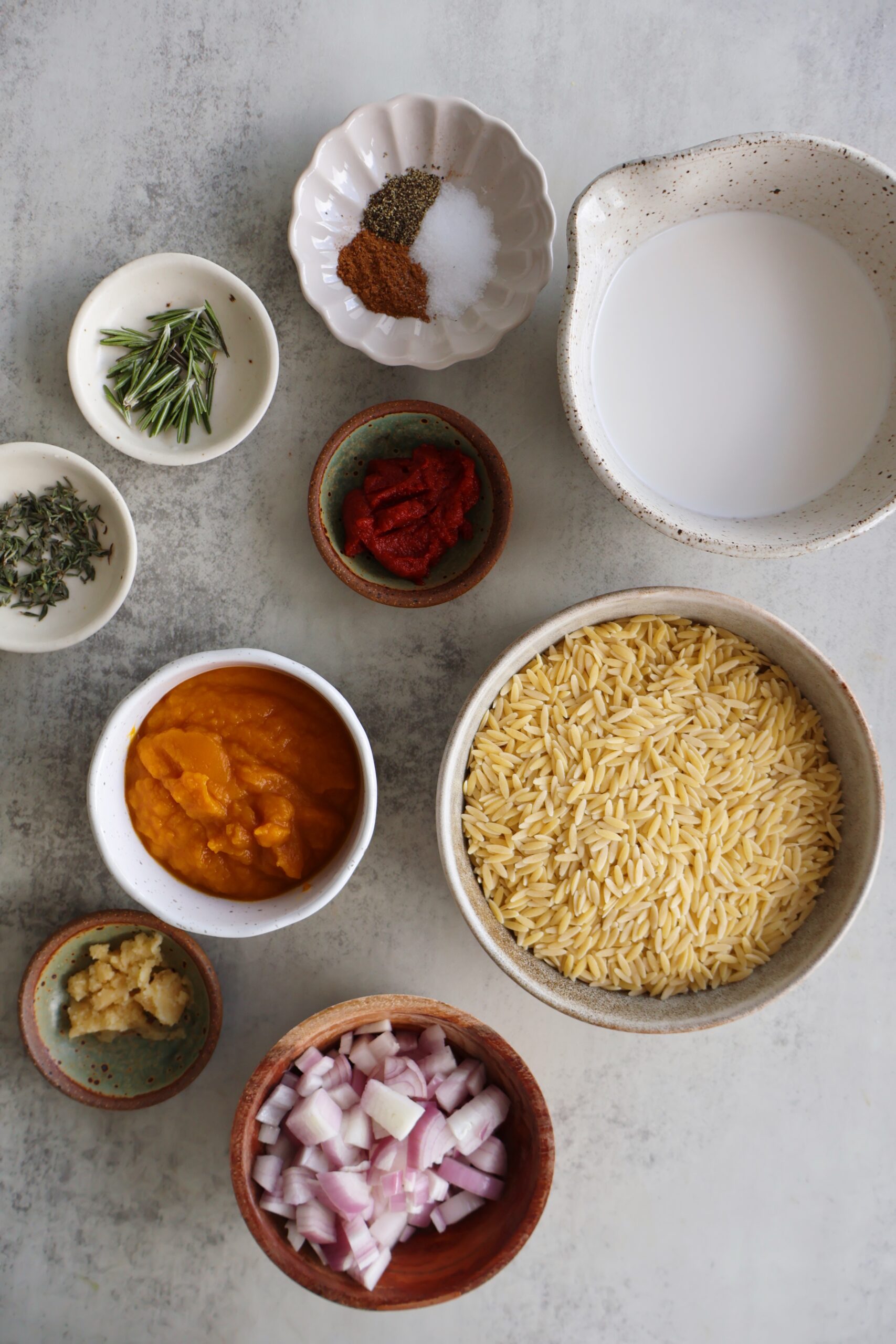 - Toss the onion with the spices, thyme and orzo to toast the orzo, then mix in the pumpkin puree and tomato paste
