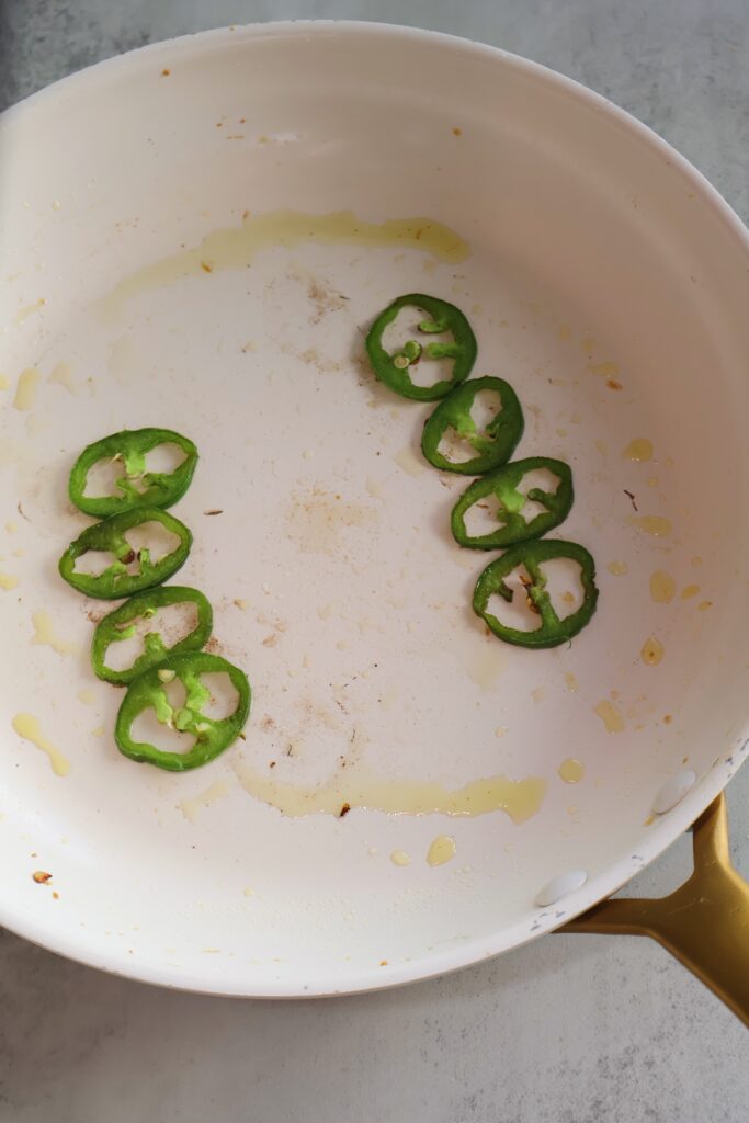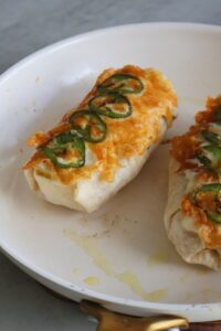 - Slice the jalapeno into thin rounds. Heat the pan on medium heat with a little more cooking spray if needed, then place 3-4 pieces of jalapenos in two horizontal lines- one for each burrito.