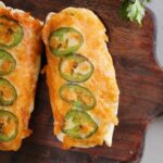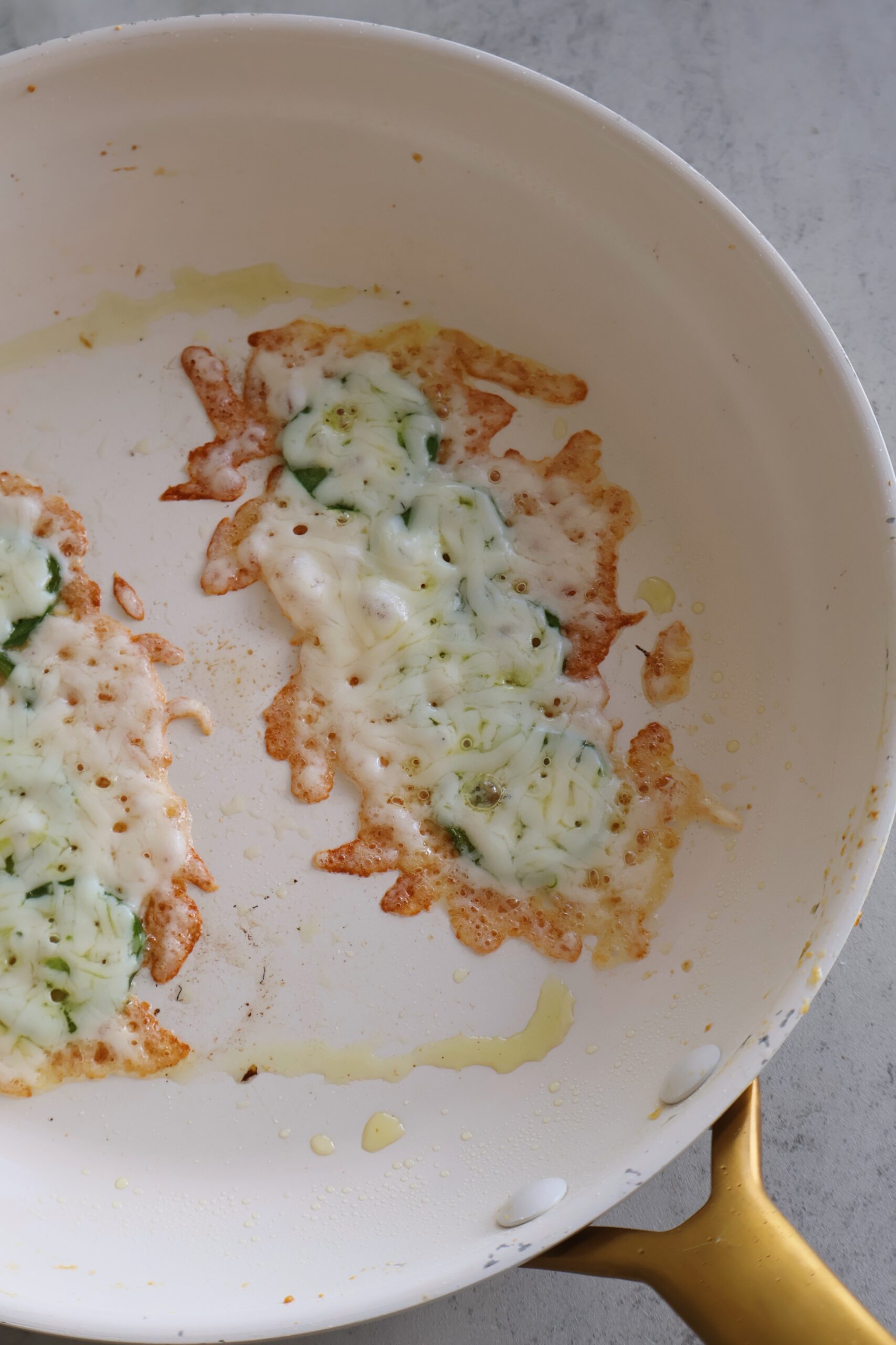 - Prepare the crispy cheese layer by adding a layer of sliced jalapenos to a greased pan and letting them cook for 1-2 minutes. Then, sprinkle a layer of cheese right on top of the peppers. The cheese will take about 1-2 minutes to brown, so watch it carefully