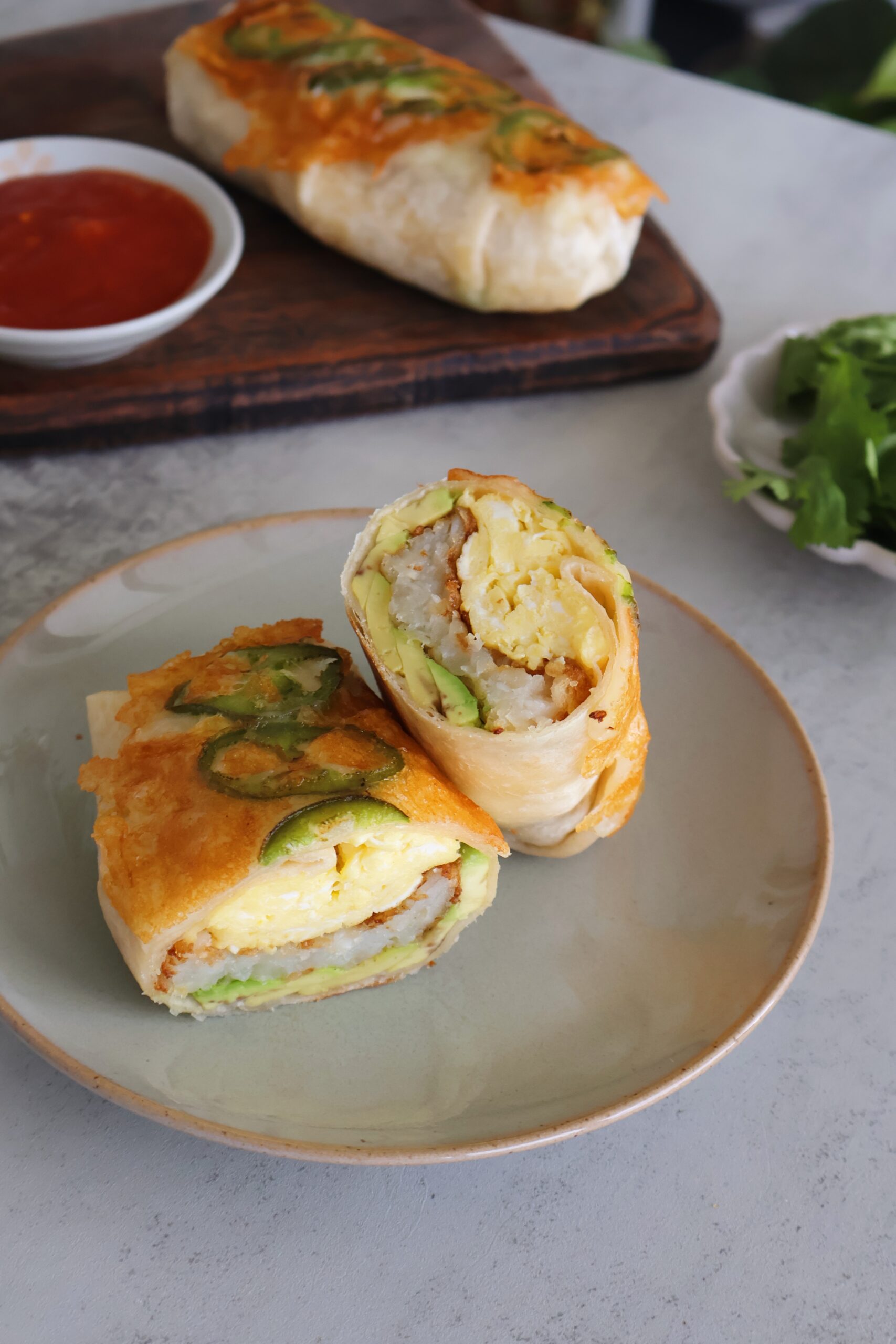 These crispy cheese breakfast burritos are a fun and delicious breakfast or lunch to serve with salsa, sour cream or yogurt and hot sauce. Scrambled eggs, crispy hash browns and avocado are rolled into a burrito, then grilled onto a crispy jalapeno cheese coating for a delicious, savory breakfast combination.