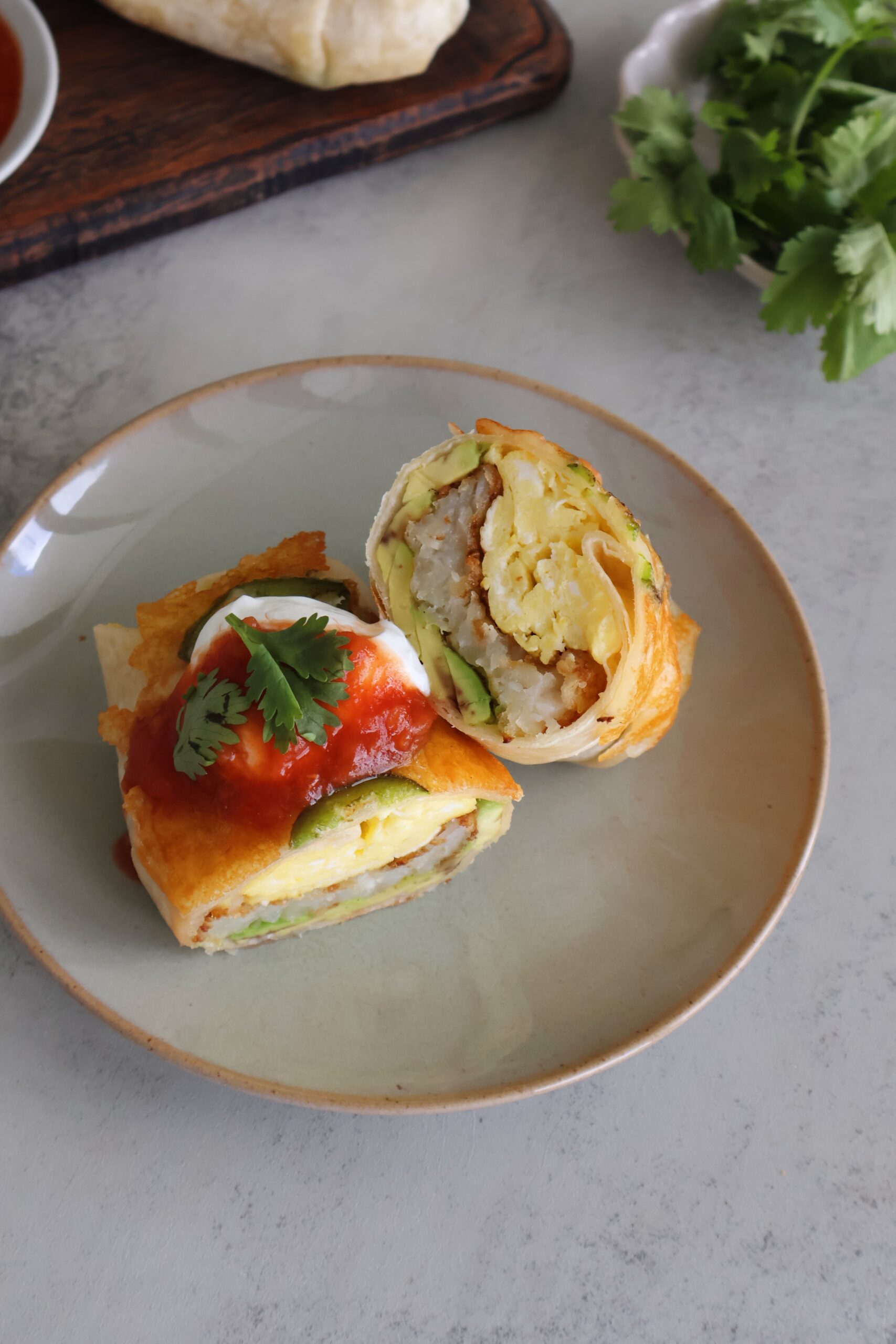 - Assemble the burritos by placing a layer of avocado, scrambled eggs and hash brown in the center of your tortilla. Fold the centers in, then fold the bottom over and roll