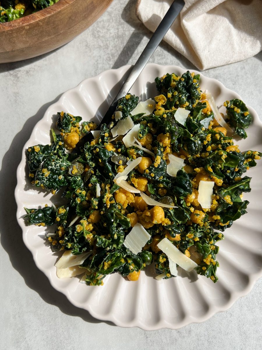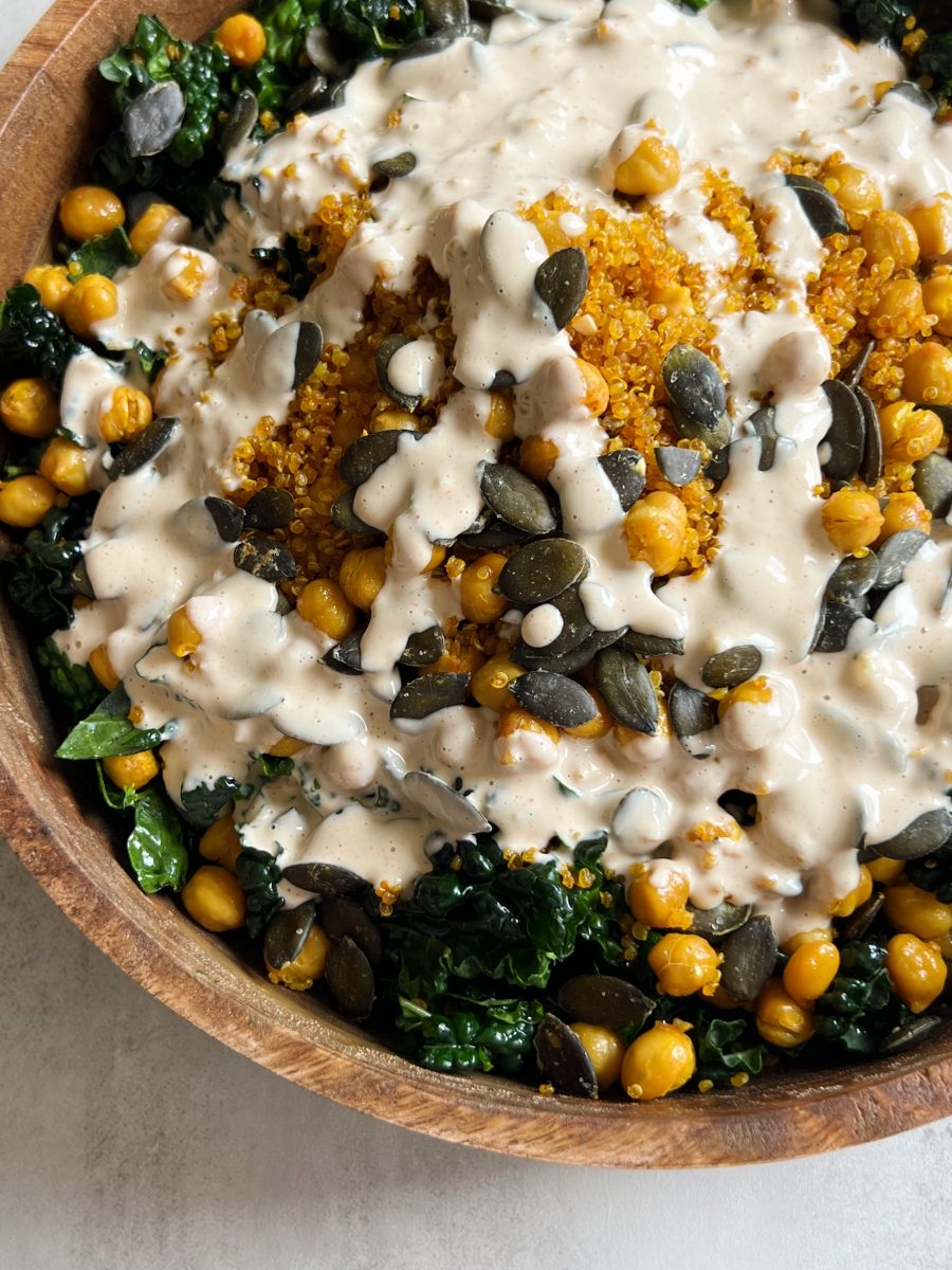 This hearty kale salad is tossed in a creamy lemon tahini dressing and topped with crispy quinoa and chickpeas. It’s such a flavorful salad to enjoy alone or topped with your favorite protein.