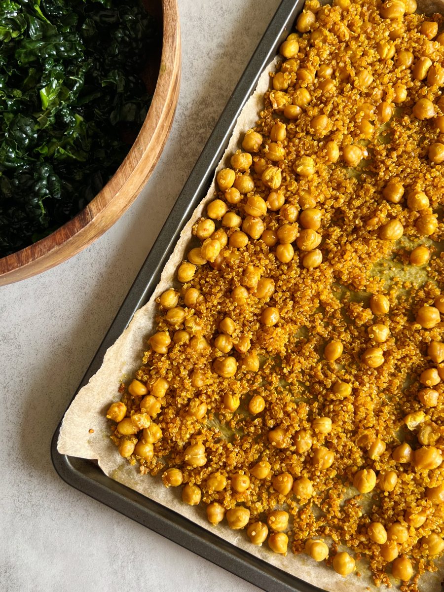 - Add the cooked quinoa to a baking sheet with the drained chickpeas. Toss together with the 2 tbsp of olive oil, salt, turmeric, garlic powder and smoked paprika.
