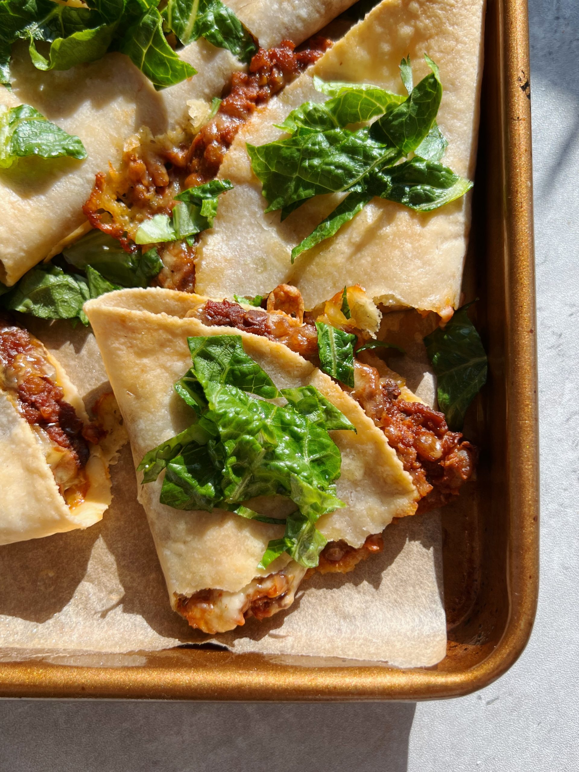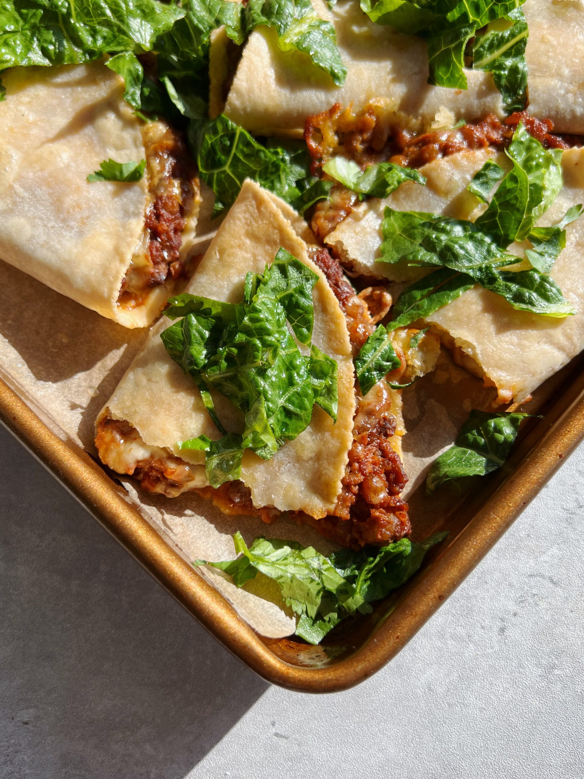 - Layer your folded tortillas on a sheet pan, and spray lightly with cooking spray.