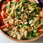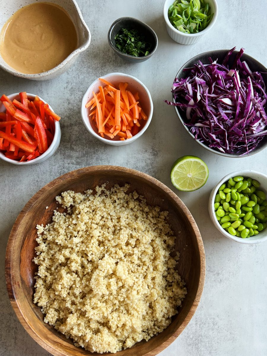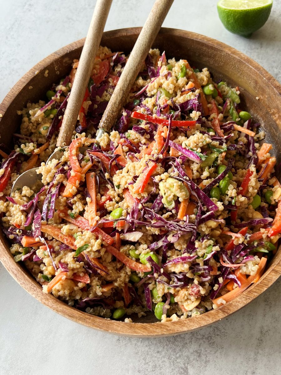 Crunchy quinoa salad with Thai-inspired peanut sauce is a delicious, plant-based meal to prep for the week. Filled with a rainbow of veggies and feel-good ingredients.