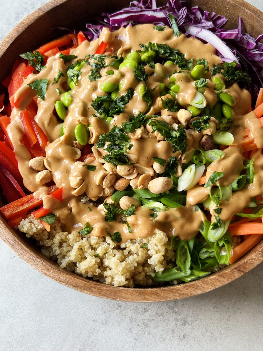 This nutrient-packed crunchy quinoa salad is made with a rainbow of vegetables and tossed in a Thai-inspired peanut sauce. Plus its packed with plant-based protein and complex carbs, making it the perfect meal prep to stock your fridge with.
