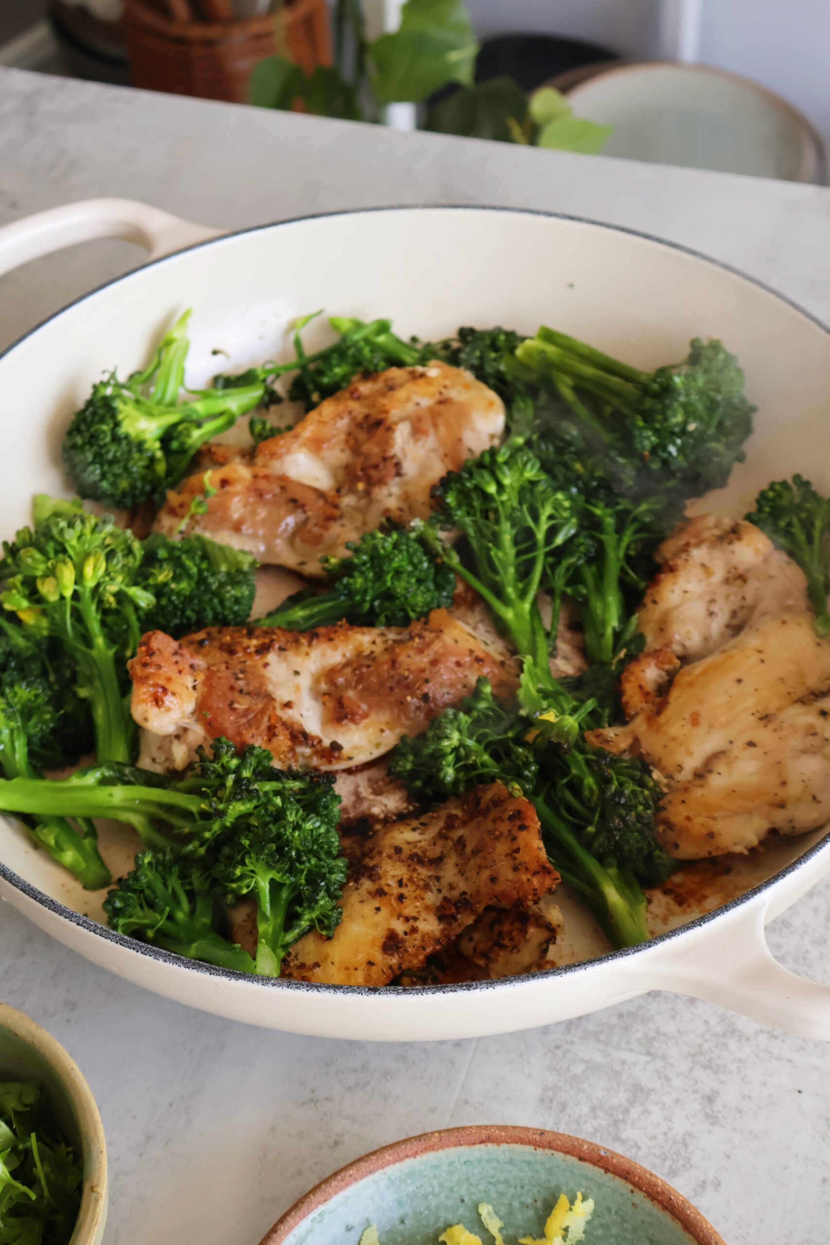 - Sear the seasoned chicken thighs in olive oil, then add the broccoli on top to steam