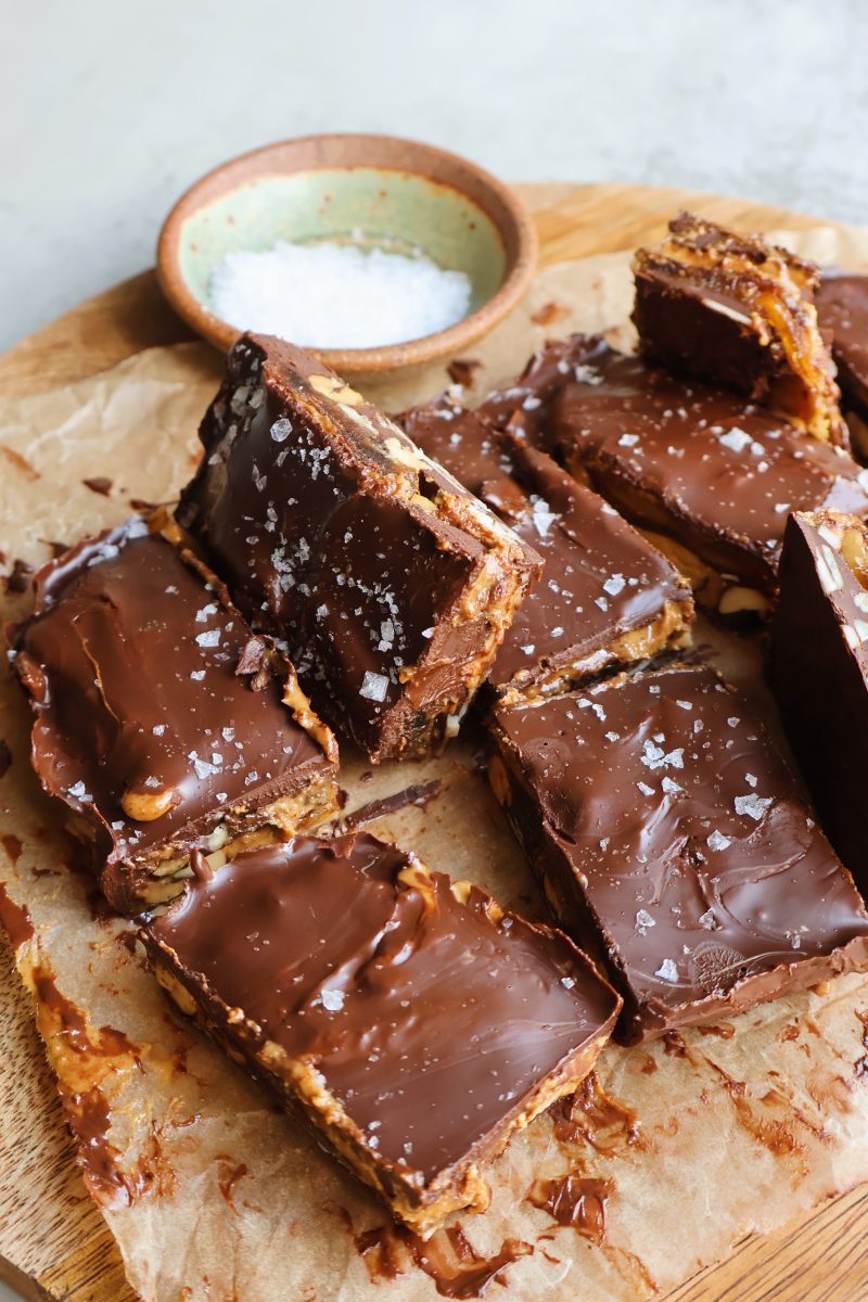 Sweet, salty and crunchy all in one. These 20-minute date and nut candy bars are such a simple yet delicious treat to keep around. They’re made with layers of melted chocolate, smashed medjool dates, crunchy nuts, creamy almonds butter and flakey sea salt.