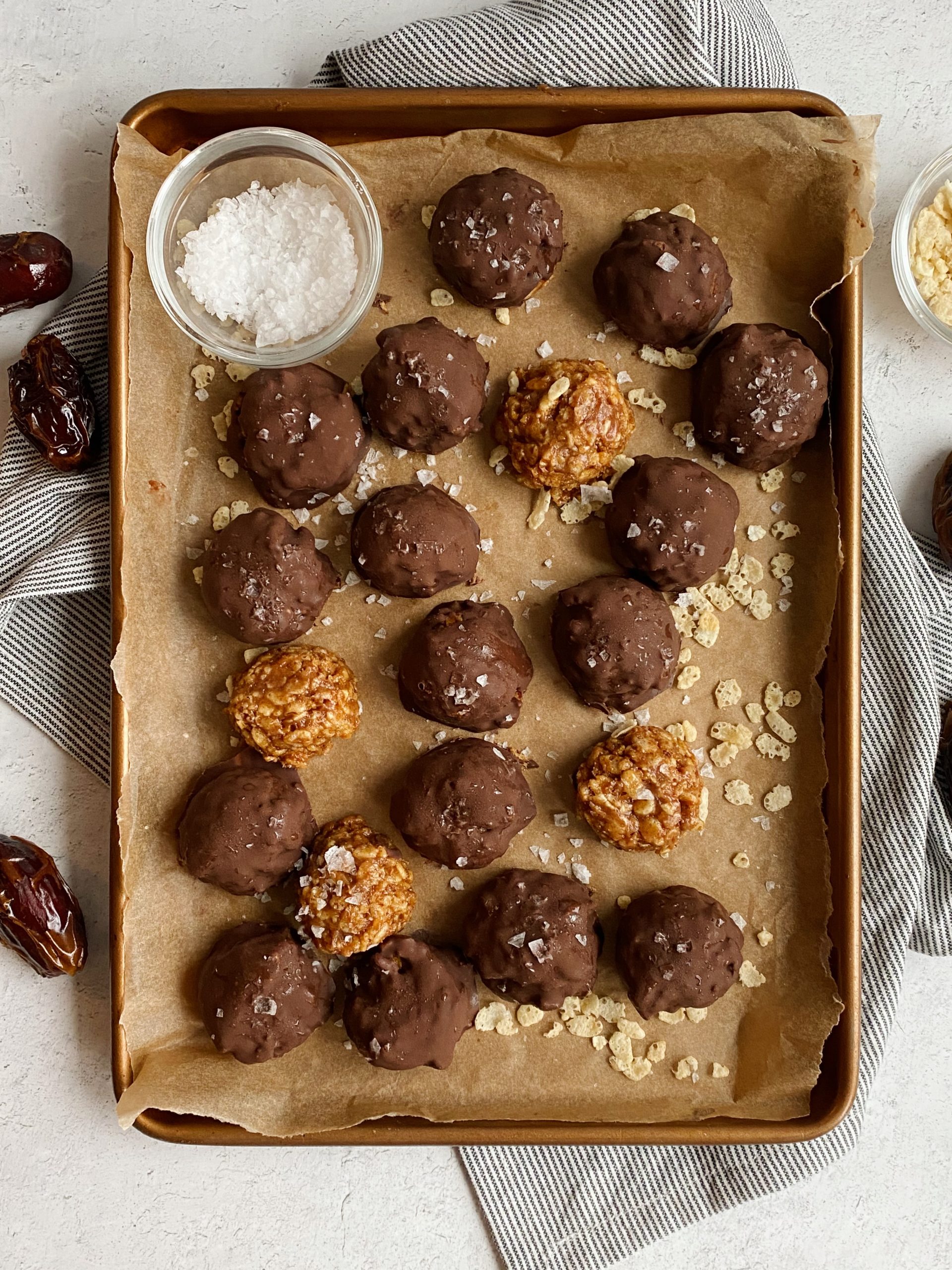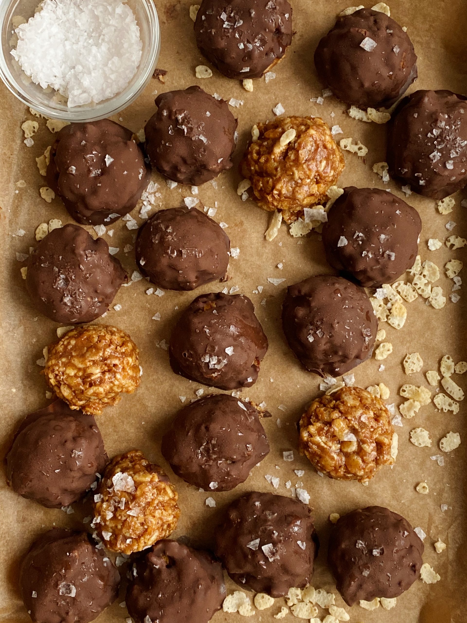- Dip each bite into the melted chocolate and place it back on the sheet pan. Top with flakey sea salt and freeze for an additional 20 minutes to harden.