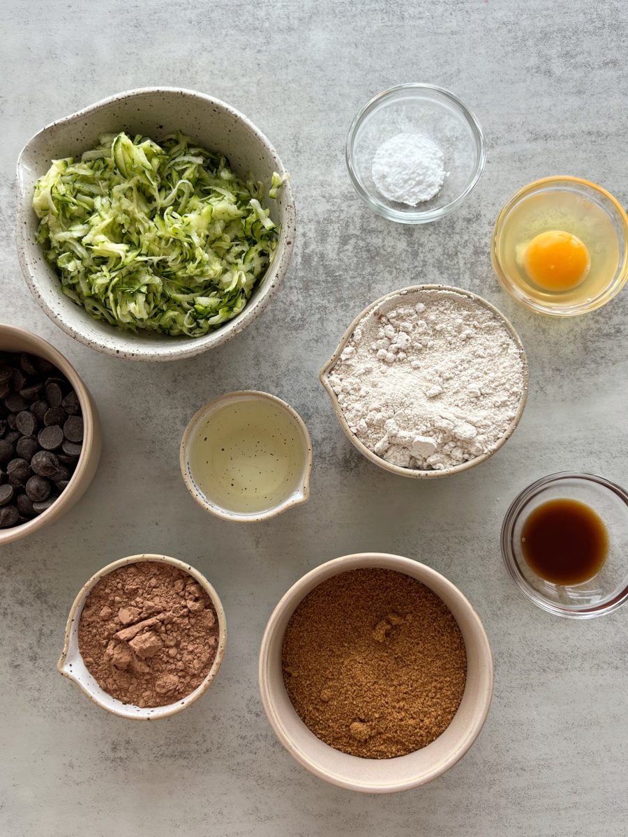 You’ll need just a few simple ingredients for these chocolate zucchini muffins. They come together in one bowl and are so easy to make. You guys are going to love them!