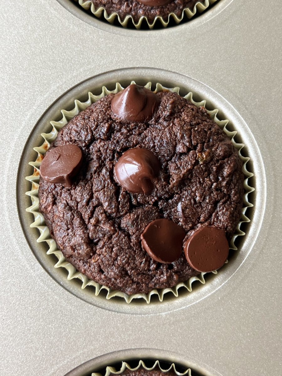 - Line a 12-count muffin pan with paper liners and spoon about 2-3 tbsp of batter into each muffin cup. Top with a few extra chocolate chips.